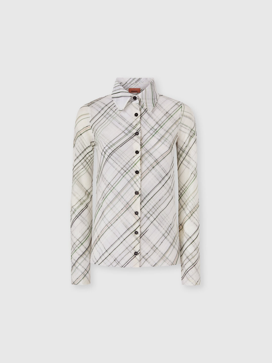 Long-sleeve women’s shirt with a criss-cross tartan motif, ideal for daytime, made from a viscose blend for soft, lightweight comfort. The graphic tartan, reimagined in a criss-cross design, brings dynamic dimension to the piece, while the viscose composition ensures fluidity and refined fit. MORE DETAILS - Women's long-sleeved shirt - Daytime criss crossed tartan weave - Viscose blend Composition: EXTERNAL:69%Rayon, 17%Polyester, 11%Wool, 2%Cotton, 1%Polyamide Care instructions: Hand wash ; Ironing maximum temperature 110°C - without steam ; Wash in net bag ; Dry cleaning in tetrachloroethene ; Wash inside out ; Dry flat ; Do not tumble dry ; Reshape when damp ; Do not bleach Made in: Italy Product ID DS25WJ16BK01FOSM9W6