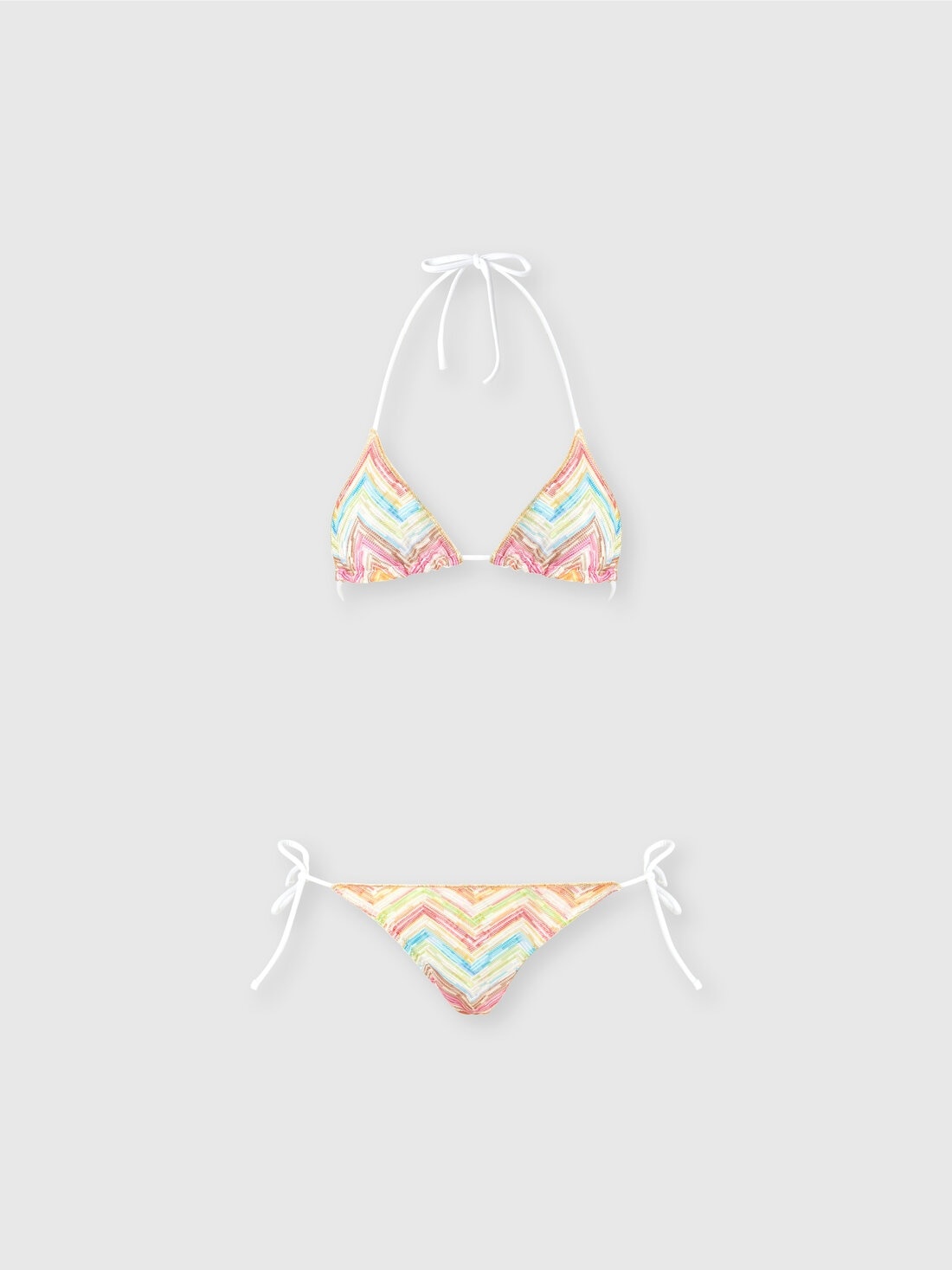 This triangle bikini in printed raschel tulle combines lightness and liveliness thanks to the zigzag pattern that characterizes the fabric. The V-neck and center gathering enhance the decollete, while the lace-up briefs offer an adjustable fit. A pop and refined two-piece, ideal for those looking for a beach look that captures attention with style. MORE DETAILS - Triangle bikini - Briefs with laces - Zig zag pattern - Raschel - Printed tulle Composition: EXTERNAL:100%Polyester; LINING : 80%Polyamide, 20%Elastane Care instructions: Hand wash ; Do not tumble dry ; Do not dry clean ; Do not iron ; Do not bleach Made in: Italy Product ID MC22SP00BR010XSM9N5