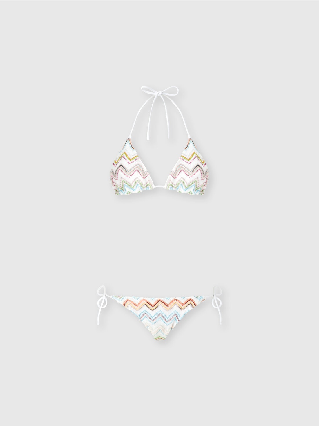 Bikini with triangle bra with the iconic zigzag pattern of the Missoni maison in a 3D variant illuminated by the metallic reflections conferred by lame and embellished with raschel workmanship. The briefs with side ties offer a personalized fit while the triangle design enhances the decollete, maintaining the balance between aesthetics and comfort, for an iconic and functional style. MORE DETAILS - Triangle bikini - 3D Zig Zag Pattern - Raschel and lame processing - Briefs with laces Composition: EXTERNAL:61%Rayon, 30%Polyester, 9%Metal Fiber; LINING : 80%Polyamide, 20%Elastane Care instructions: Hand wash ; Do not tumble dry ; Do not dry clean ; Do not iron ; Do not bleach Made in: Italy Product ID MC22SP00BR0101SM9KZ