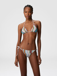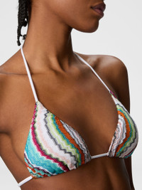 This triangle bikini features a refined wave pattern in lame fabric, which catches the light with a brilliant and sophisticated effect. The sinuous lines and the play of reflections create an elegant and refined aesthetic, enhancing the silhouette with a touch of glamour, perfect for those who want an exclusive look even by the sea. MORE DETAILS - Triangle bikini - Wave pattern - Lame filaments Composition: EXTERNAL:95%Rayon, 5%Metal Fiber; LINING : 80%Polyamide, 20%Elastane Care instructions: Hand wash ; Do not tumble dry ; Do not dry clean ; Do not iron ; Do not bleach Made in: Italy Product ID MC22SP00BR0100SM9L0