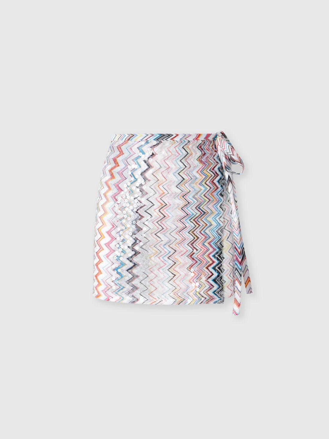 The wrap mini skirt with a side tie stands out with a ribbed Raschel design, enriched by the iconic zigzag pattern and sparkling sequin details. Ideal for adding a touch of glamour to summer outfits. MORE DETAILS - Women's mini pareo skirt - Striped raschel workmanship - Iconic zig zag pattern with sequins Composition: EXTERNAL:64%Rayon, 36%Polyester Care instructions: Ironing maximum temperature 110°C - without steam ; Dry cleaning in tetrachloroethene ; Do not tumble dry ; Do not wash ; Do not bleach Made in: Italy Product ID MS25SH0GBR012VSM9QG