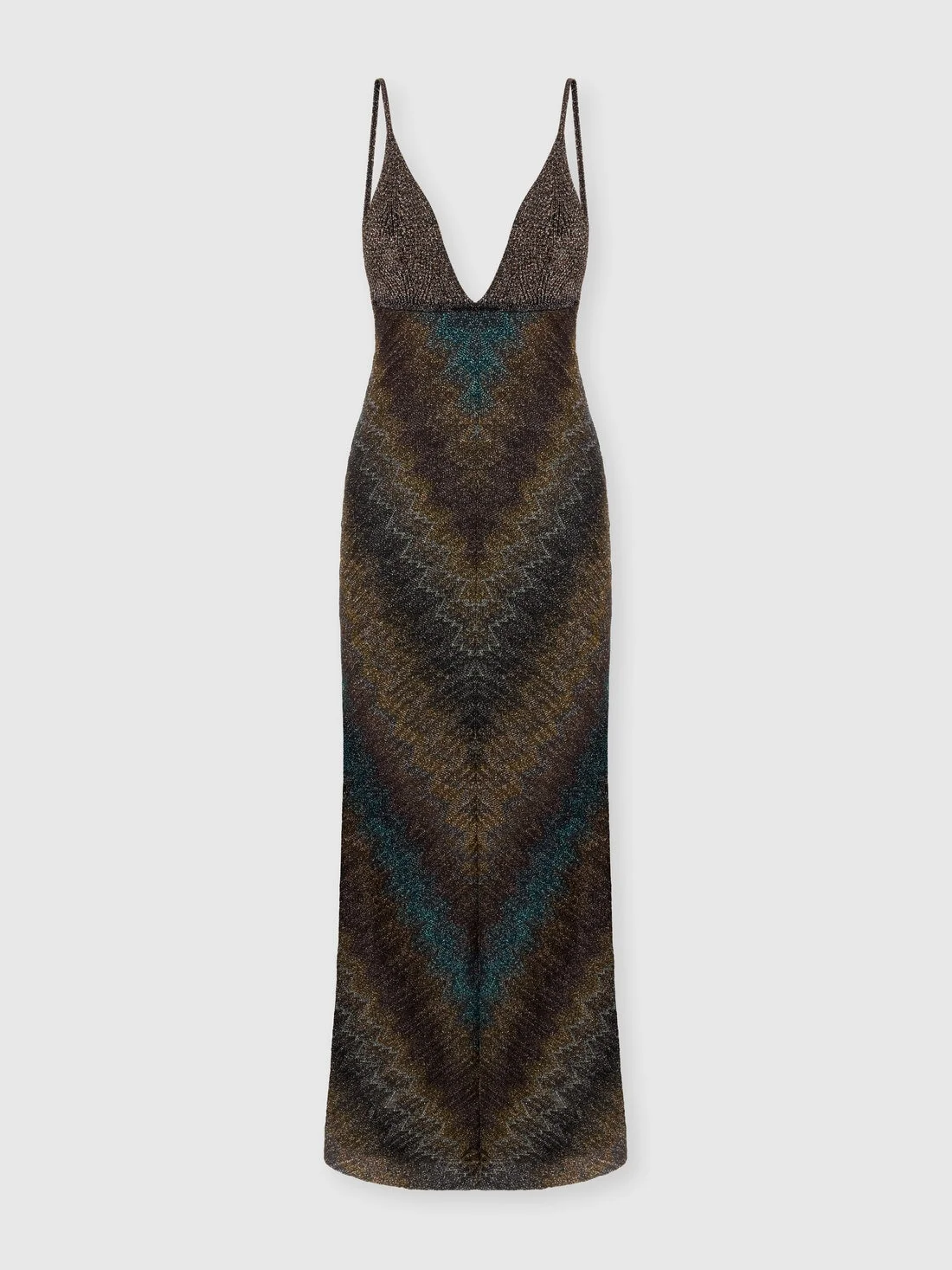 MORE DETAILS - Women's long dress with deep neckline - Raschel knit and degrade snake pattern - Viscose lame Composition: EXTERNAL:83%Rayon, 17%Metal Fiber; LINING : 77%Polyamide, 23%Elastane Care instructions: Ironing maximum temperature 110°C - without steam ; Hand wash ; Do not tumble dry ; Dry flat ; do not soak ; Do not dry clean ; Cool Hand Wash ; Do not bleach Made in: Italy Product ID DS26SG28BR014SS91RN