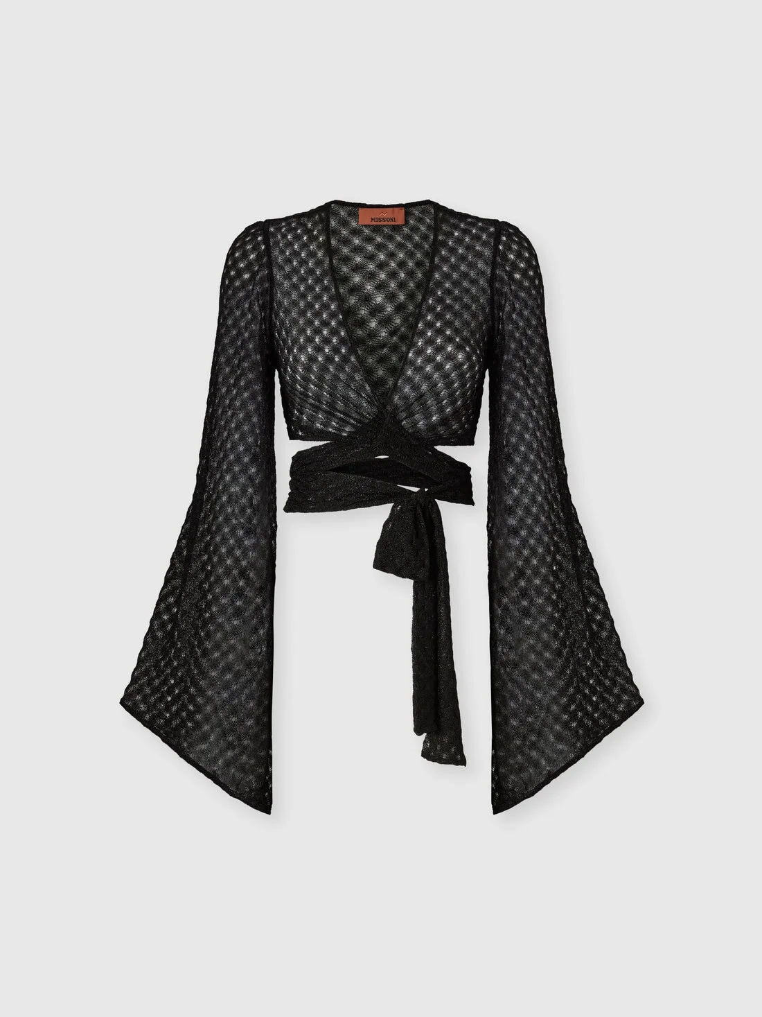 MORE DETAILS - Women's wrap-style top - Long sleeves - Raschel knit - Spiderweb lace pattern - Viscose lame Composition: EXTERNAL:83%Rayon, 17%Metal Fiber Care instructions: Ironing maximum temperature 110°C - without steam ; Dry cleaning in tetrachloroethene ; Do not tumble dry ; Do not wash ; Do not bleach Made in: Italy Product ID MC26SK01BR014RS91RE