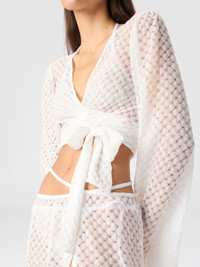 MORE DETAILS - Women's wrap-style top - Long sleeves - Raschel knit - Spiderweb lace pattern - Viscose lame Composition: EXTERNAL:83%Rayon, 17%Metal Fiber Care instructions: Ironing maximum temperature 110°C - without steam ; Dry cleaning in tetrachloroethene ; Do not tumble dry ; Do not wash ; Do not bleach Made in: Italy Product ID MC26SK01BR014RS01JW