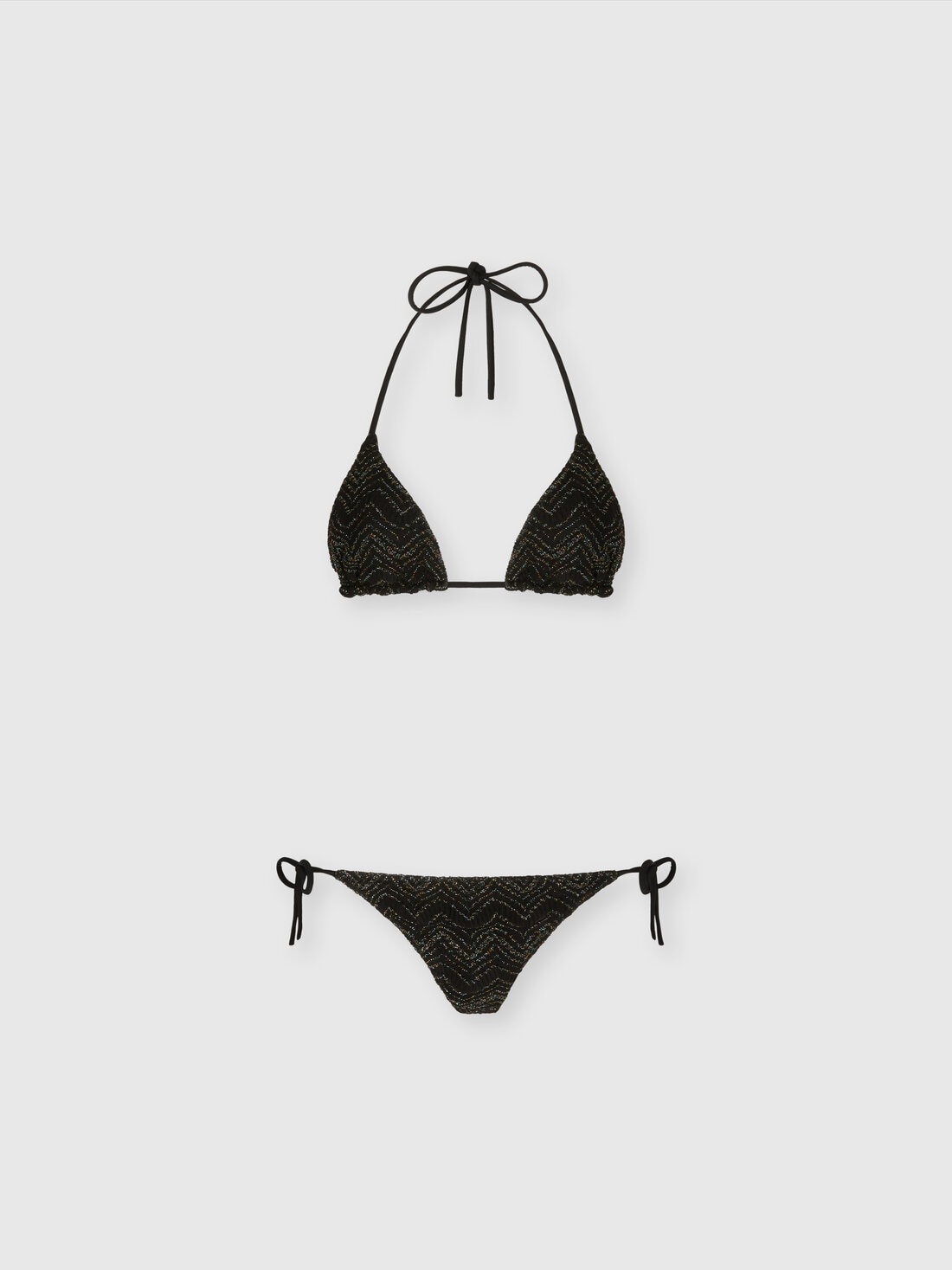 Straight from the maison's archive, the iconic chevron motif takes on new life in the viscose bikini by Missoni. The triangle bra and the briefs with side ties offer an adjustable fit, enhancing the silhouette with a refined sensuality. The addition of lame yarn gives a touch of light and dynamism, for a bright and sophisticated look. MORE DETAILS - Viscose and lame triangle bikini - Chevron pattern - Briefs with laces Composition: EXTERNAL:91%Rayon, 9%Metal Fiber; LINING : 80%Polyamide, 20%Elastane Care instructions: Hand wash ; Do not tumble dry ; Do not dry clean ; Do not iron ; Do not bleach Made in: Italy Product ID MC22SP00BR00ZXS91N1