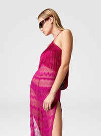 Evoking boho chic allure, Missoni's long jumpsuit in lame viscose lace explores sophisticated and creative elegance. The zig-zag pattern, enriched by the luminous reflections of lame, gives the fabric a unique texture, while the top decorated with light fringes adds a touch of movement. The fluid and enveloping silhouette enhances the figure with grace, making this garment distinctive and refined. MORE DETAILS - Long viscose jumpsuit - Fringed top - Zigzag pattern Composition: EXTERNAL:91%Rayon, 9%Metal Fiber Care instructions: Ironing maximum temperature 110°C - without steam ; Dry cleaning in tetrachloroethene ; Do not tumble dry ; Do not wash ; Do not bleach Made in: Italy Product ID MS25SG00BR00ZXS5074