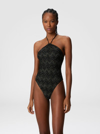 Zig zag lamé viscose one-piece swimsuit with halter neck