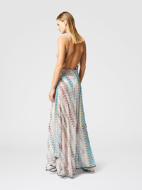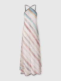 The mesh cover-up dress with zigzag pattern and sequins is a celebration of transparency and light. Crafted from lightweight, shimmering fabric, the garment features a halter neckline and an open back, with contrasting straps that add a graphic touch. The mesh work creates a seductive and sophisticated effect, transforming this dress into a key piece for a summer look with a glamorous and refined spirit. MORE DETAILS - Long cover-up dress - Mesh Processing - Zig zag pattern - Sequin inserts - Halter neckline Composition: EXTERNAL:95%Rayon, 3%Polyamide, 2%Polyester Care instructions: Ironing maximum temperature 110°C - without steam ; Dry cleaning in tetrachloroethene ; Do not tumble dry ; Do not wash ; Do not bleach Made in: Italy Product ID MS25SQ16BV00GQSM9MV