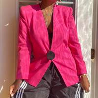 Vintage pink blazer with black detail snap button and pockets. MATERIAL: 50% Viscose 50% Polyester MEASUREMENTS: Pit to pit 16in. Chest 36in. Waist 34in. Sleeves 12in. Vintage items tend to run smaller in size, so we recommend going up a size or checking your measurements. #vintage #pink #pinkblazer #vintageblazer #y2k