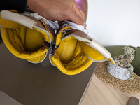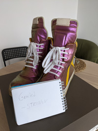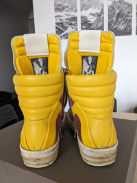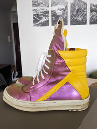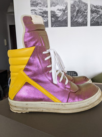 EU size 42 Geos, fit 42.5-43. Lots of life left! (like really) → Worn in geobaskets in amazing iridescent colorway. → Sample pair, comes with a box → I drag my heels a lot, so I had to repair them. → A couple of scuffs, but in general great condition. 6.7/10