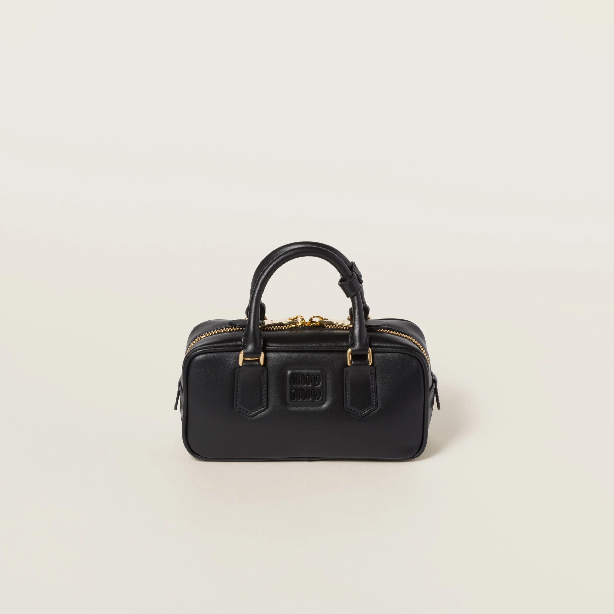 This Arcadie leather bag expresses a notion of fashion as a means of translating a reaction to current reality into material form. The light padding gives the bag a voluminous look and a cosmopolitan style. The lettering logo, which echoes the finishes of the metal hardware, crosses the boundaries between function and decoration and helps to define the distinctive and iconic aesthetic of the top-handle bag. - Product code: 5BB142_ACR3_F0002_V_OON - Light padding - Leather handles - Detachable, adjustable 105 cm leather shoulder strap - Gold-tone hardware - Varnished metal lettering logo on the front - Zipper closure - Cotton satin lining with zipper pocket - With purse feet - Imported Height 10.5cm Width 22cm Length 7.5cm Materials Main material: Calfskin