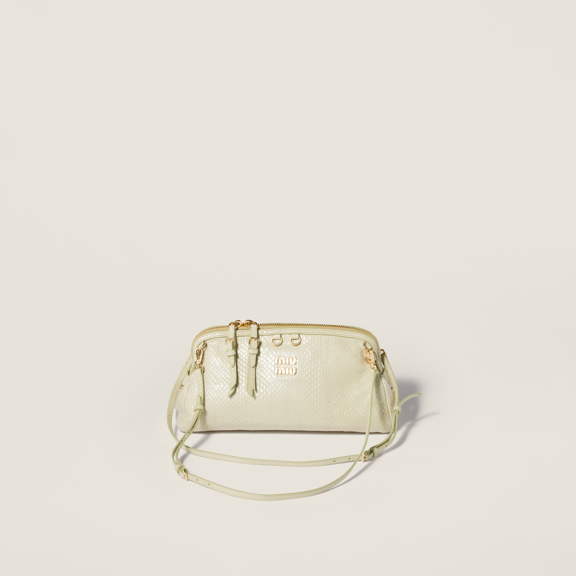The purity of form and refined texture of Ayers leather encapsulate the essence of this clutch bag that can be worn over the shoulder or carried by hand, where fashion show inspirations and functional experimentation blend into the distinctive features of Miu Miu style. - Product code: 5BF130_2AMP_F0362_V_OLO - With double sliding and removable Ayers leather shoulder strap. Minimum length: 60 cm - Maximum length: 70 cm - Minimum drop: 26 cm - Maximum drop: 30 cm - Gold-tone hardware - Zipper closure - Nappa leather interior with double zipper pocket - Metal lettering logo on the front - The bag can be worn in three ways: on the shoulder, by hand after removing the straps, or worn crossbody by joining the two straps to form a longer one - Imported Height 14.5cm Width 28cm Length 10cm Materials Main material: Masked Watersnake