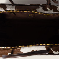 The sleek, refined line of the Beau bag is enriched by the unique texture of calf hair, enhanced by the cow print that reinterprets this iconic Miu Miu bag in a bold, contemporary version. - Product code: 5BB172_2ICT_F0EDH_V_OWN - Double leather handles - Gold-tone hardware--Cotton gabardine interior with two pockets - Leather lettering logo - Imported Height 17cm Width 30cm Length 8.5cm Materials Main material: Calfskin