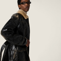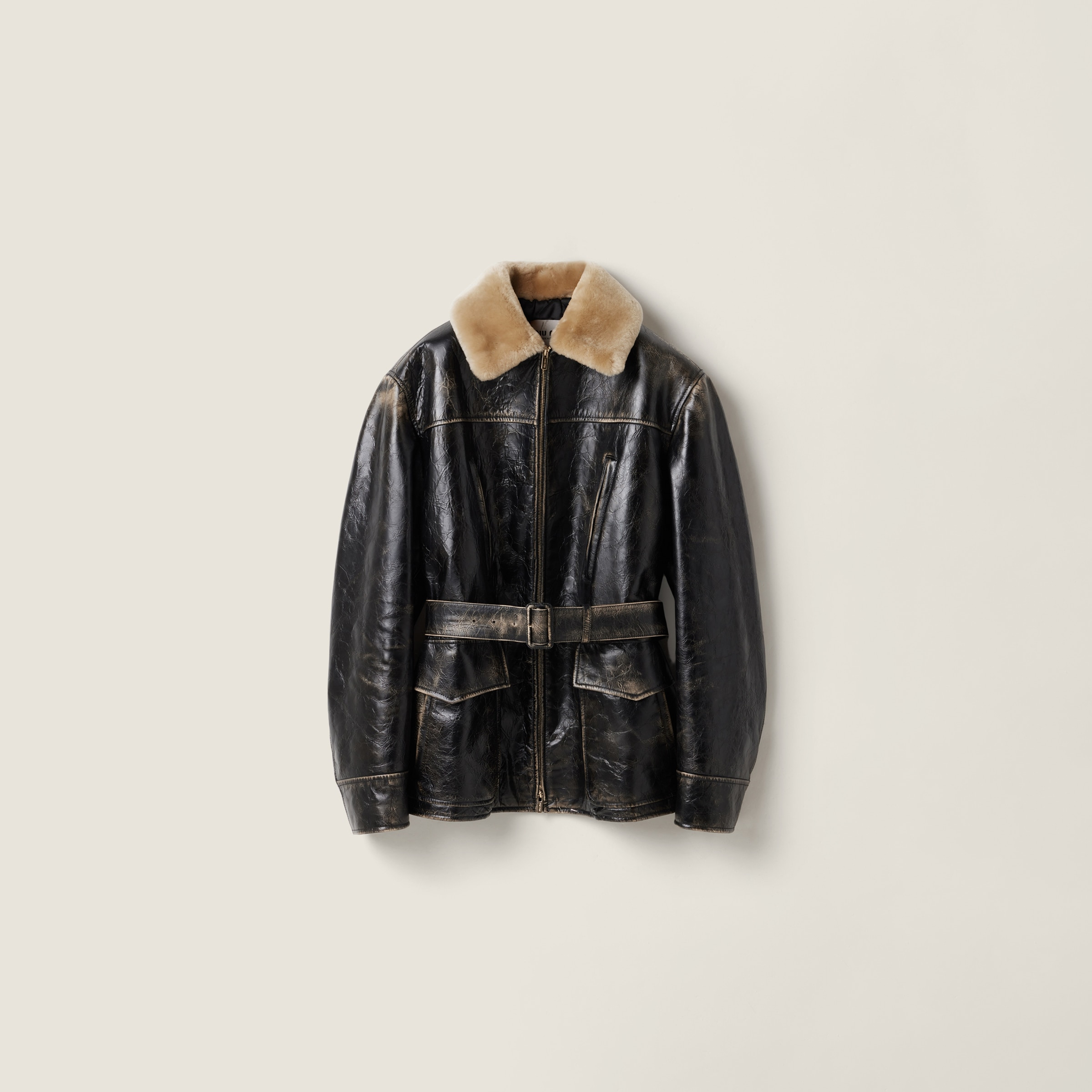 The fine calf leather of this caban jacket with a timeless, artisanal character is hand-treated to create unique shading and contrasts in color. The shearling collar and zipper closure accentuate its elegance and versatility. - Product code: MPS763_18BU_F0002_S_OOO - Quilted lining padded with wadding - Vintage treatment - Regular fit - Front zipper closure - Shearling collar - Straight sleeve - Flapped patch pockets and welt zipper pockets on the front - With belt - Embossed lettering logo - Imported - The model is 178 cm tall and wears a size 38 Height 75cm Materials Main material: Calfskin