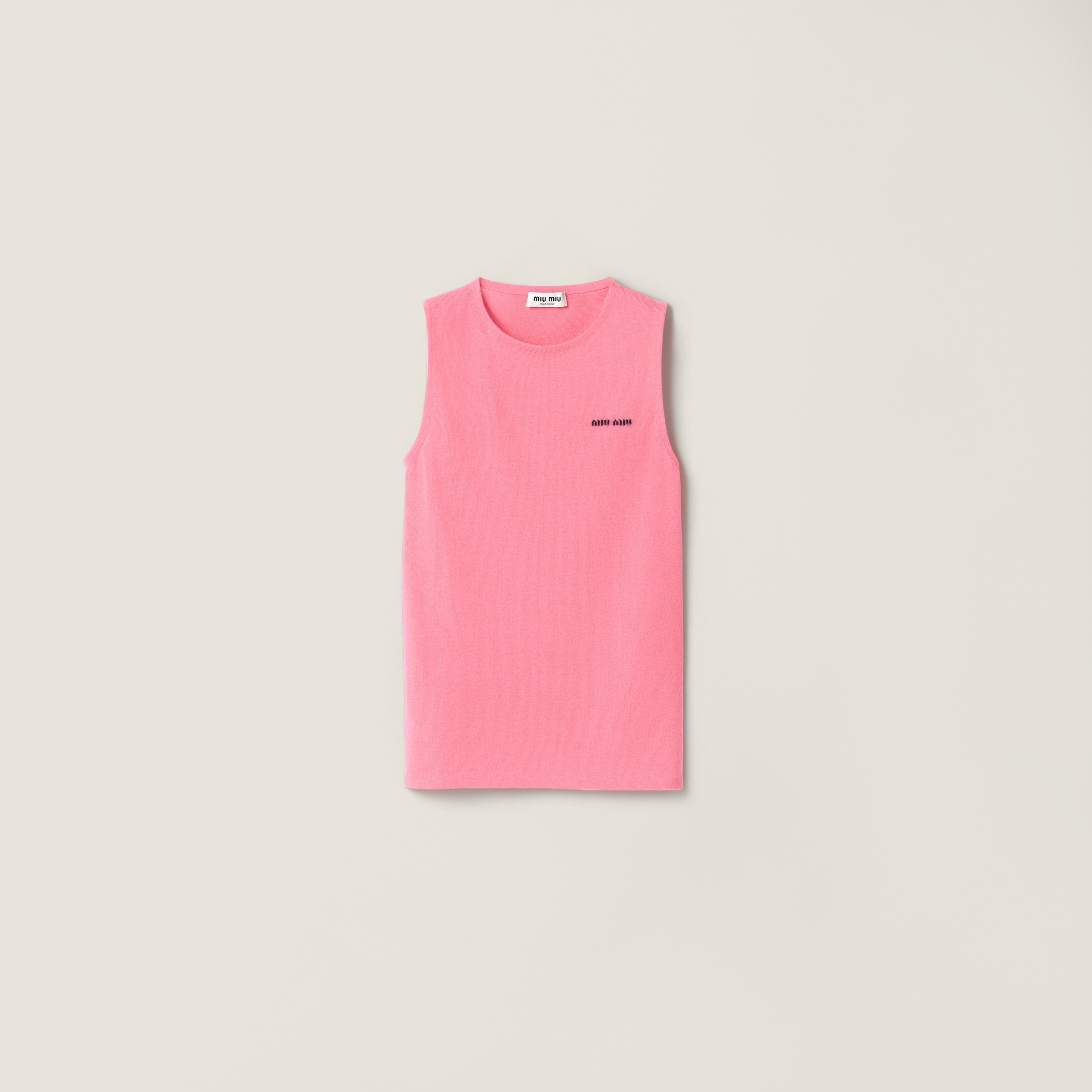 Soft cashmere shines with the luster of silk, creating a contrast between refined simplicity and the sensuous character of this knit top that comes in classic and vibrant shades, design for feminine, layered looks. - Product code: MMV314_17I7_F0AEJ_S_OOO - Plain knit - Straight fit - Sleeveless - Semi-raglan shoulder - Intarsia logo - Imported - The model is 177 cm tall and wears a size 38 Height 65cm Materials Main material: 30% Silk 70% Cashmere