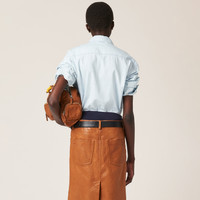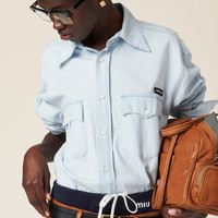 The washed treatment gives this chambray shirt a deliberate worn look. The Miu Miu logo completes the design with an iconic note. - Product code: GWC120_14UT_F0076_S_OOO - Washed treatment - Menswear fit - Unlined - Classic collar - Front button closure - Long sleeves with buttons - Front patch pocket - Matching stitching - Sartorial logo label - The product fits up to one size larger - Imported - The model is 178 cm tall and wears a size 38 Height 82cm Materials Main material: 100% Cotton