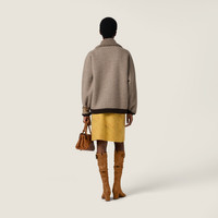 Soft fleece, a new staple of the Miu Miu wardrobe, gives this blouson jacket a relaxed attitude that reinterprets the classics from an experimental perspective, blending masculine and feminine elements. - Product code: ML1369_17I1_F0065_S_OOO - Unlined garment - Long sleeves with knit cuffs - Stand collar - Zipper closure - Vertical pockets - Knit belt - Visible logo label - Imported - The model is 178 cm tall and wears a size 38 Materials Main material: 33% Virgin Wool 67% Recycled Polyester