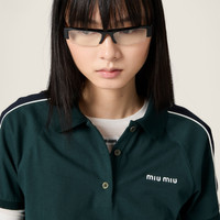 Vintage sportswear inspired the spirit of this jersey polo shirt. Racing stripes on the sides and sporty piping interact with Miu Miu's iconic codes and versatility. - Product code: MJNA19_182D_F0R3V_S_OOO - Straight fit - Unlined garment - Polo collar - Front button closure - Short sleeves - Twin-needle hem - Embroidered logo - Imported - The model is 177 cm tall and wears a size 38 Height 49cm Materials Main material: 100% Cotton
