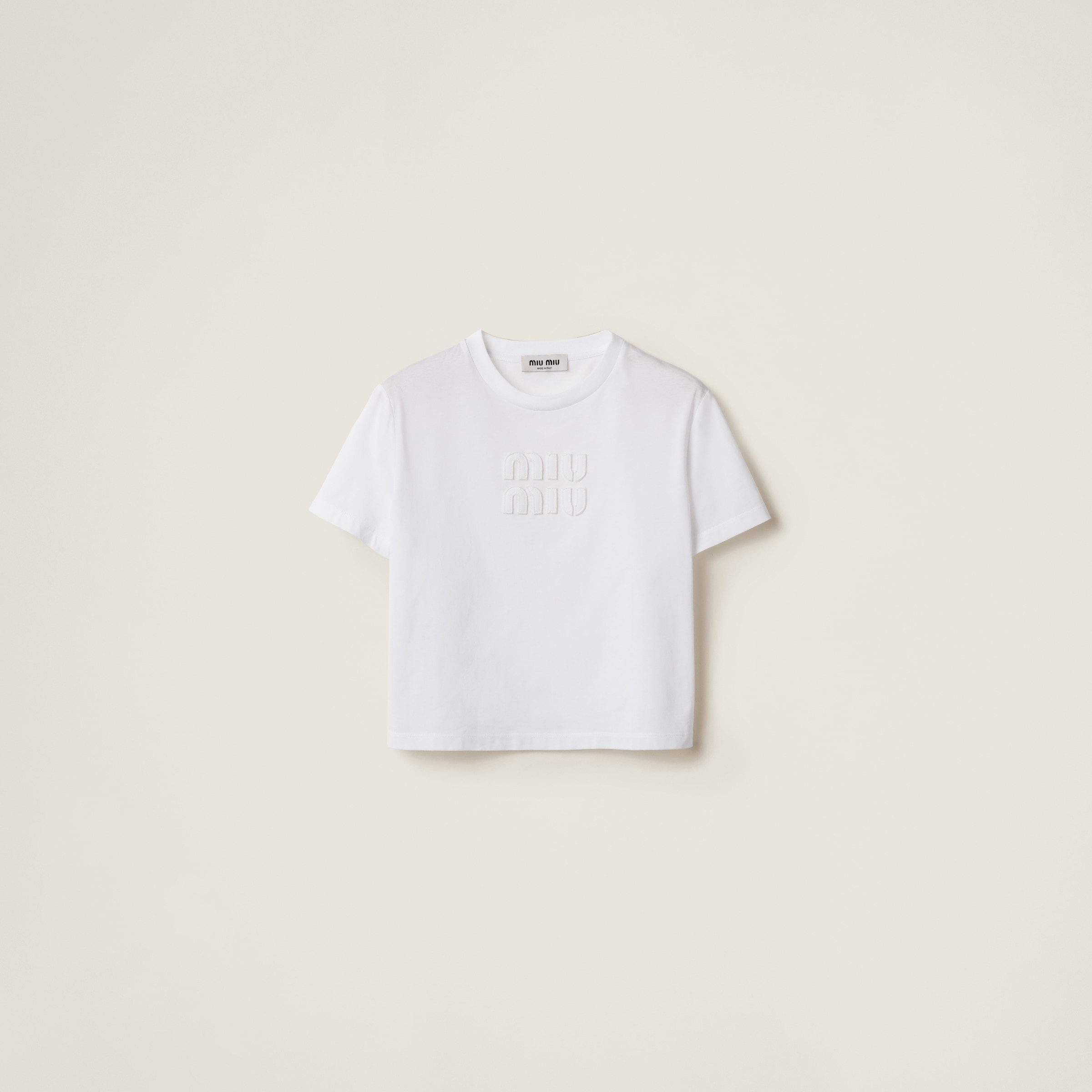The embroidered Miu Miu logo stands out against the simple lines of this cotton jersey tee, thanks to its iconic character. - Product code: MJN483_1YXT_F0009_S_232 - Regular fit - Crew-neck - Short sleeves - Embroidered logo - Twin-needle hem - Imported - The model is 180 cm tall and wears a size 38 Height 70cm Materials Main material: 100% Cotton