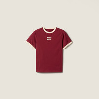 The relaxed, casual style of the tee is paired with the iconic attitude of the Miu Miu logo, defining a distinctive contrast in color that expresses its contemporary, casual identity. - Product code: MJNA17_1841_F0X61_S_OOO - Straight fit - Unlined garment - Crew-neck - Short sleeves - Twin-needle hem - Embroidered logo - Imported - The model is 178 cm tall and wears a size 38 Height 70cm Materials Main material: 100% Cotton