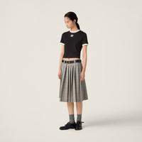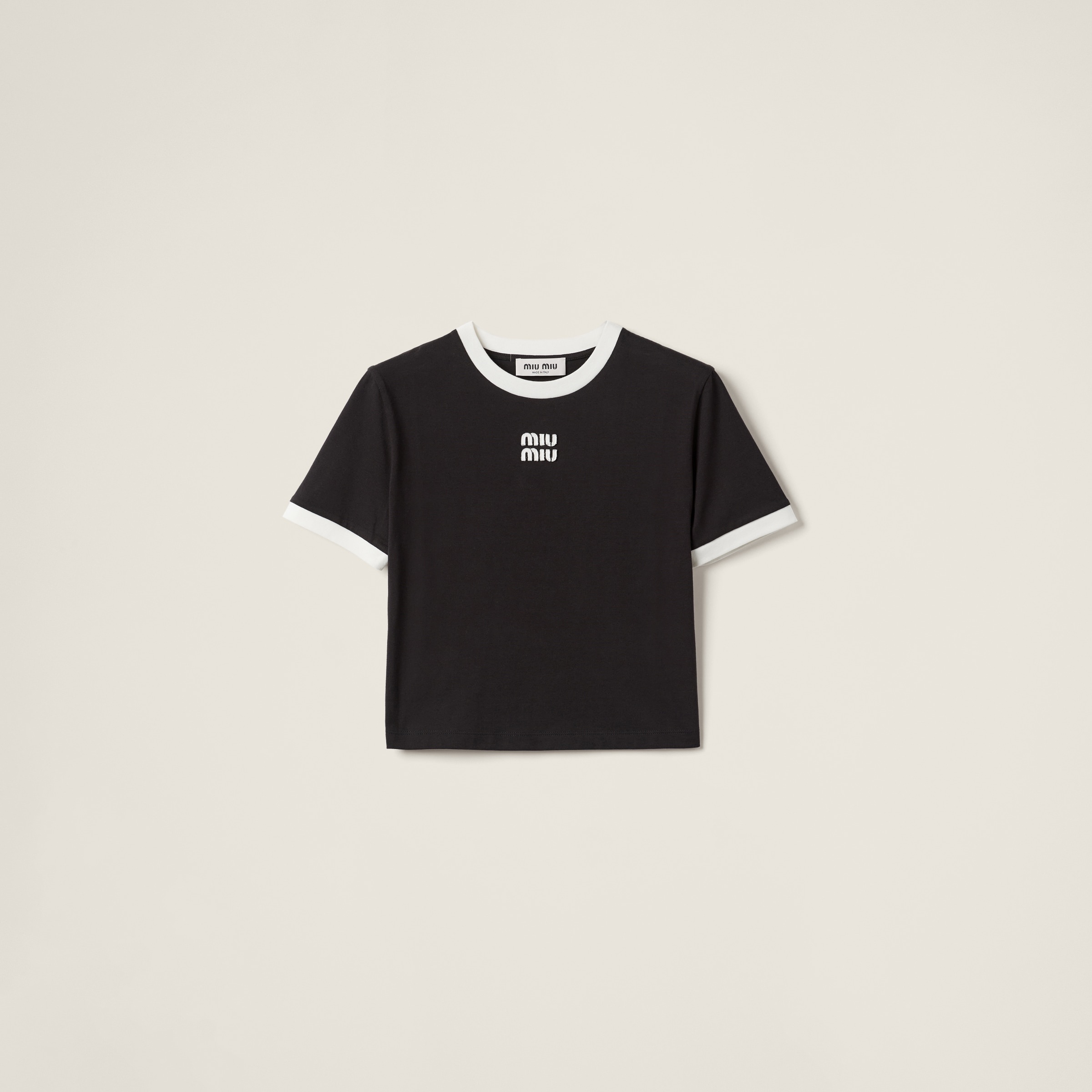 The embroidered Miu Miu logo gives an immediately iconic note to the sleek lines of this tee. Trim on the crew neck and sleeves recalls the nuances of the logo, coordinating colors on this garment. - Product code: MJN522_14EL_F0002_S_OOO - Straight fit - Crew-neck - Short sleeve - Embroidered logo - Twin-needle hem - Imported - The model is 177 cm tall and wears a size 38 Height 46cm Materials Main material: 100% Cotton