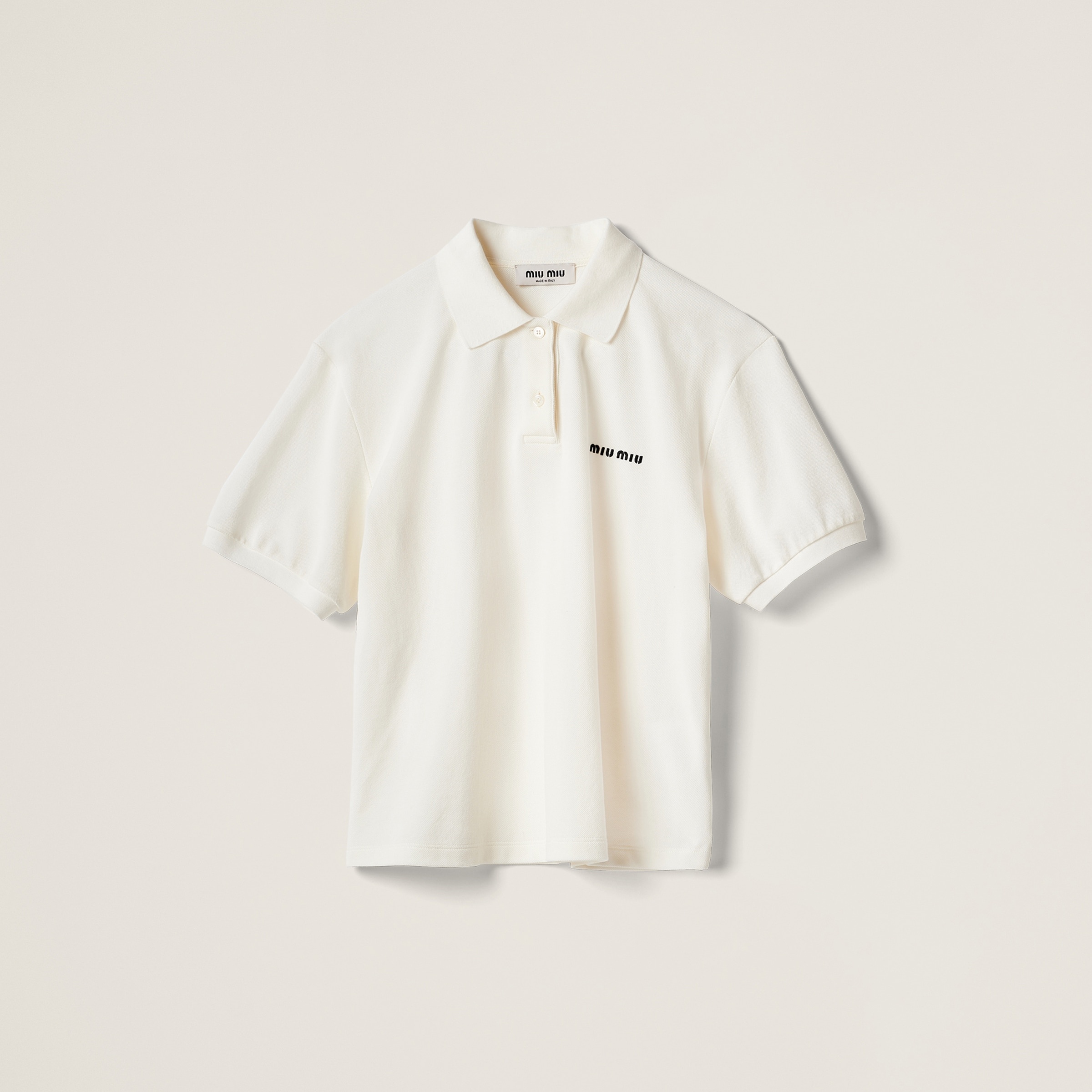 The casual style of the polo shirt meets Miu Miu's distinctive character in this cotton pique polo shirt. The embroidered logo completes the design. - Product code: MJN535_14RW_F0009_S_OOO - Boxy fit - Polo-style collar - Front button closure - Short sleeves - Embroidered logo - Long slits on the sides - Twin needle hem - Imported - The model is 176 cm tall and wears a size 38 Height 58cm Materials Main material: 100% Cotton