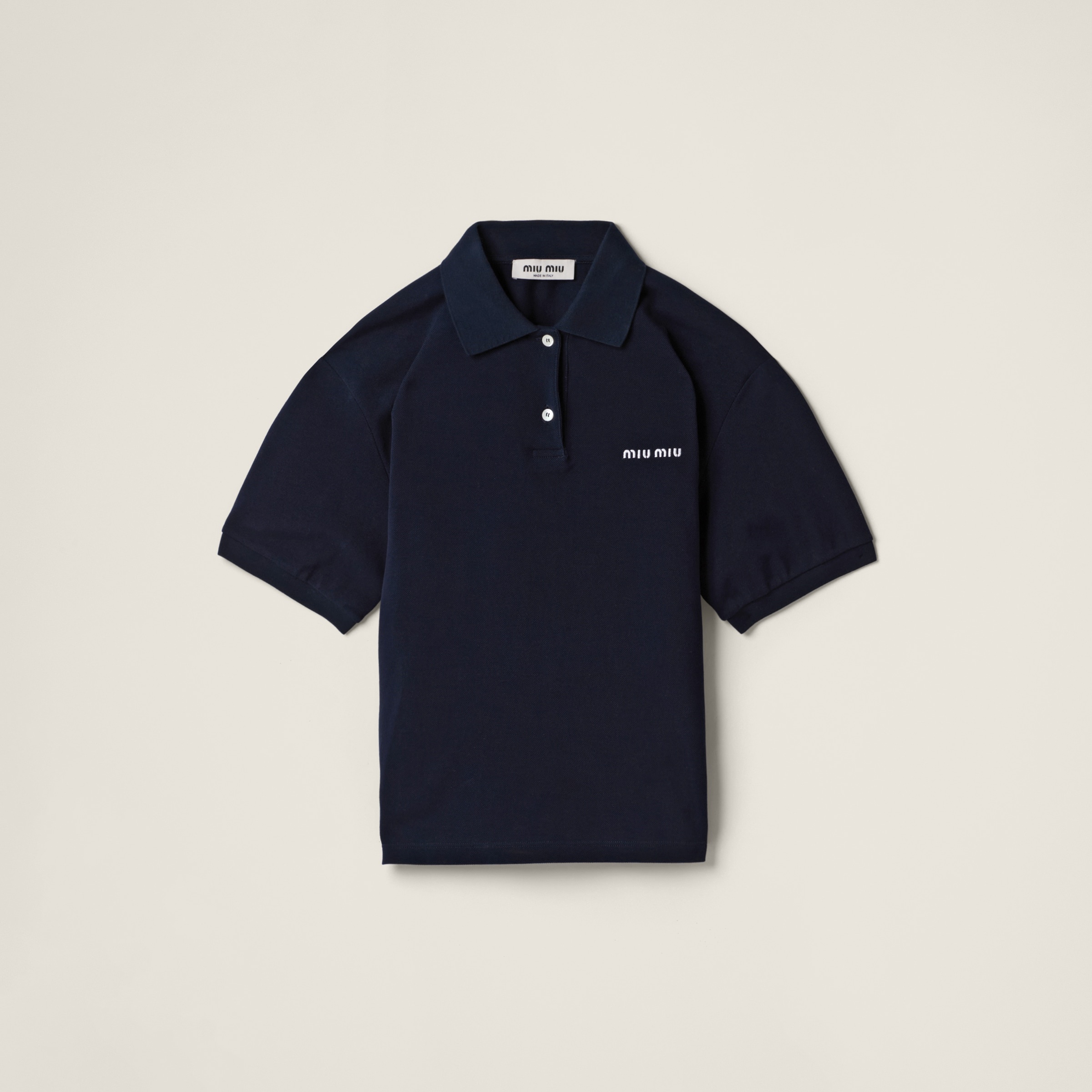 The casual style of the polo shirt meets Miu Miu's distinctive character in this cotton pique polo shirt. The embroidered logo completes the design. - Product code: MJN535_14RW_F0008_S_OOO - Boxy fit - Polo-style collar - Front button closure - Short sleeves - Embroidered logo - Long slits on the sides - Twin needle hem - Imported - The model is 180 cm tall and wears a size 38 Height 58cm Materials Main material: 100% Cotton
