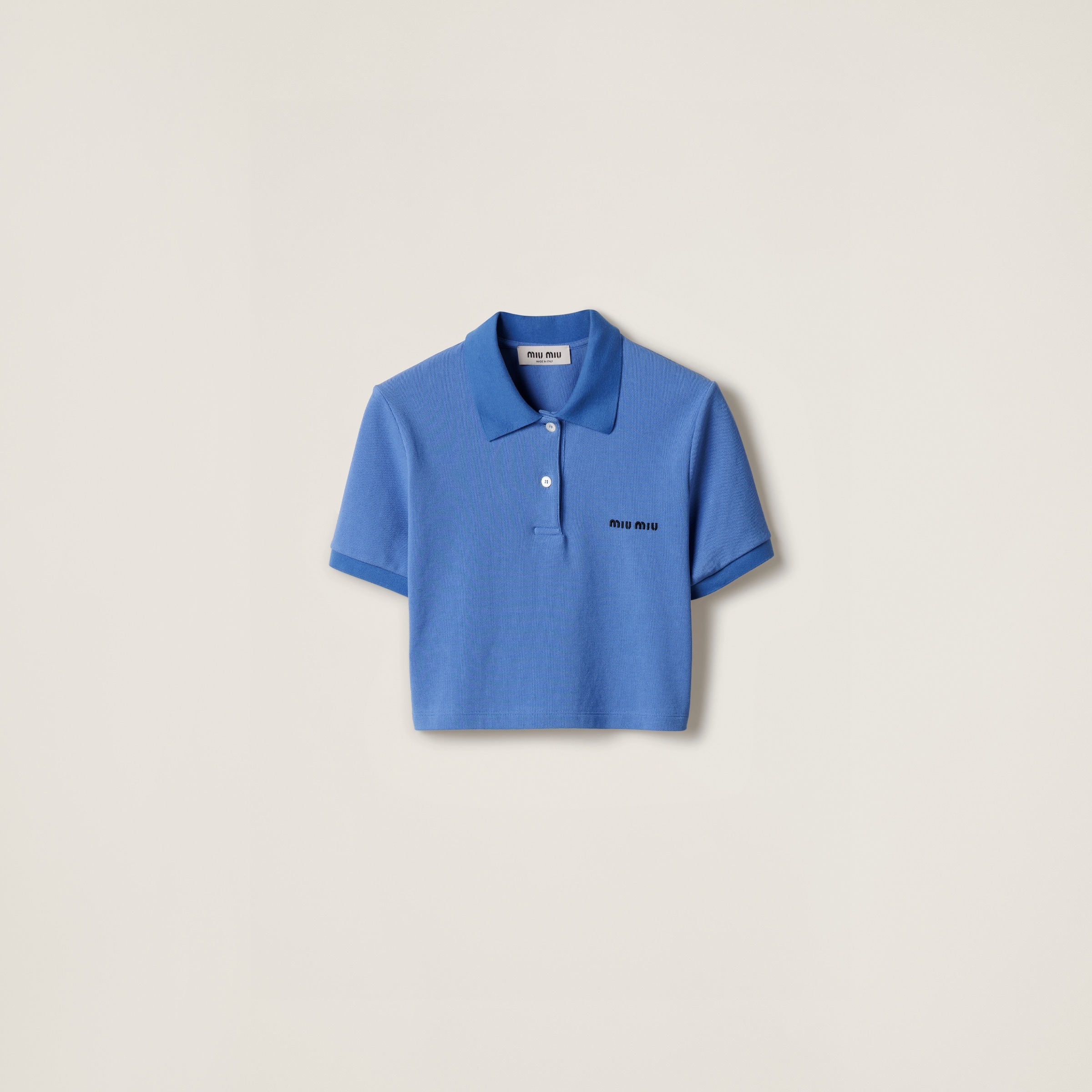 The classic pique polo shirt is reinterpreted for the new season in this slightly cropped version that embodies the bold, authentic essence of Miu Miu charm. - Product code: MJN547_14RW_F0237_S_OOO - Straight fit - Polo collar - Front button closure - Short sleeves - Side slits - Twin-needle hem - Embroidered logo - Imported - The model is 177 cm tall and wears a size 38 Height 58cm Materials Main material: 100% Cotton