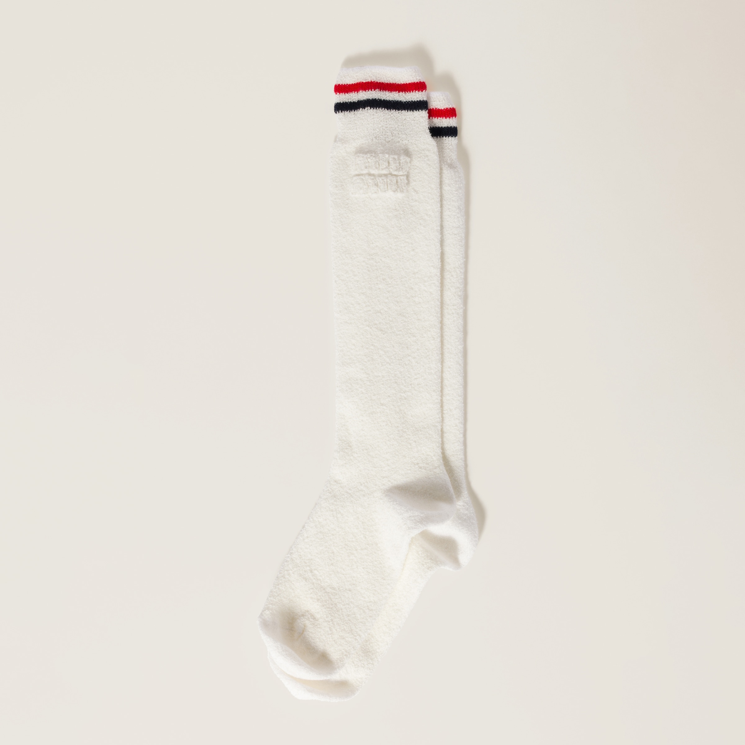 A styling element that completes the look with Miu Miu's experimental character, these socks stand out for their sponge knit and iconic intarsia logo. - Product code: MCZ517_17NZ_F0ALS_S_OOO - Sponge knit - Intarsia logo - Imported Materials Main material: 100% Cotton