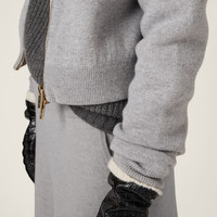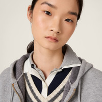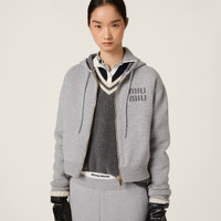 The iconic zipper cardigan is reinterpreted in fine double knit cashmere and the Miu Miu intarsia logo, highlighting its relaxed, contemporary essence. - Product code: MMF901_15NG_F0031_S_OOO - Double knit - Long sleeves - Boxy fit - Hooded collar - Front zipper closure - Semi-raglan shoulder - Ribbed knit cuffs and hem - Intarsia logo - Imported - The model is 178 cm tall and wears a size 38 Height 52cm Materials Main material: 100% Cashmere