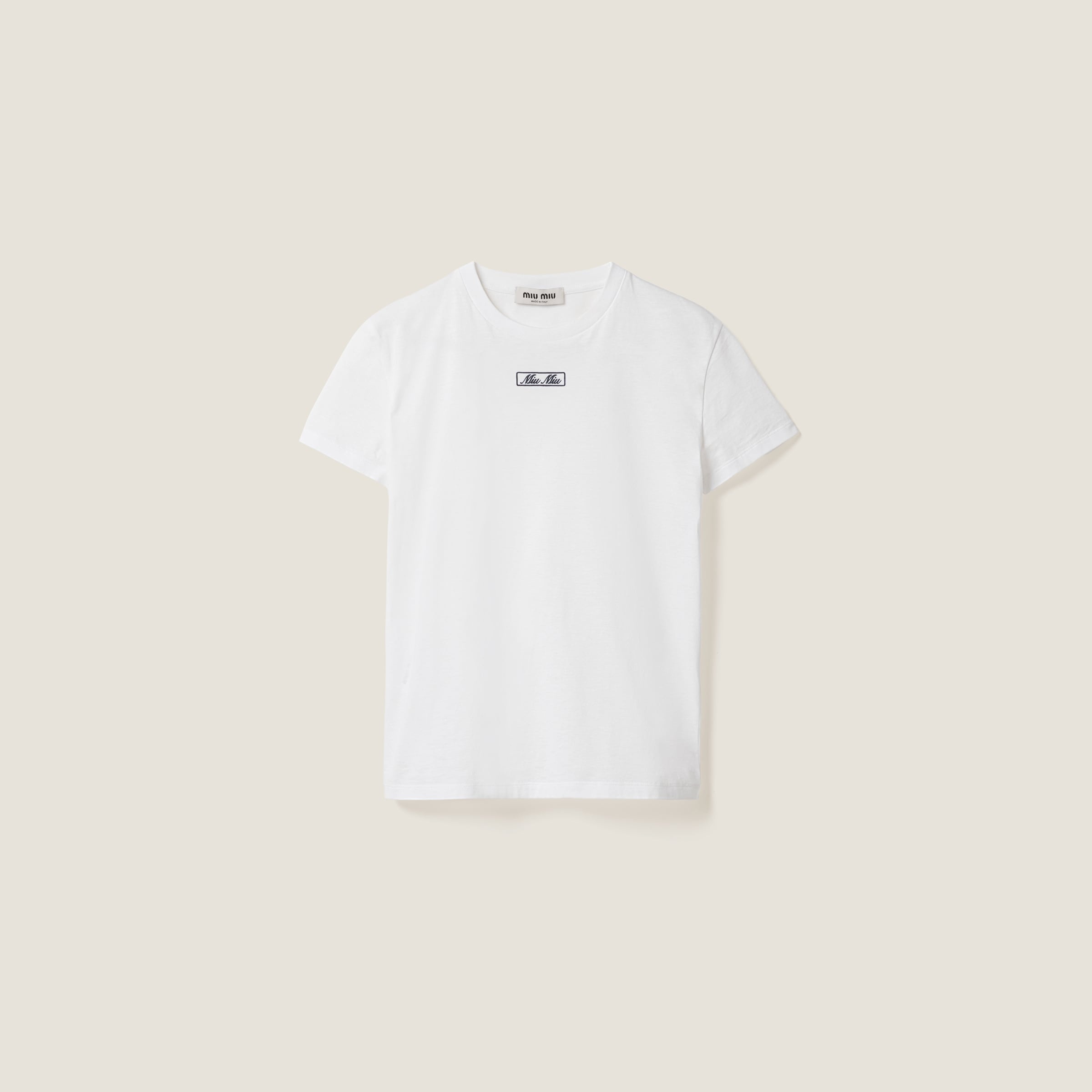 Miu Miu's embroidered logo stands out on the sleek lines of this cotton jersey tee thanks to its iconic character. - Product code: MJN383_14ER_F0009_S_OOO - Straight fit - Crew-neck - Short sleeves - Embroidered logo - Twin needle hem - Imported - The model is 180 cm tall and wears a size 38 Height 64cm Materials Main material: 100% Cotton