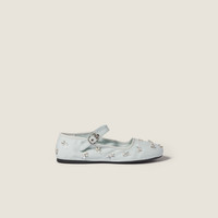 Sophisticated comfort and a simple texture add a new twist to the iconic Miu Miu ballerina flat made of drill and decorated with crystal floral embellishments that reveal its young, feminine spirit. - Product code: 5F617E_3ZMU_F0035_F_005 - Upper with crystal embellishments - Rubber sole - With strap and buckle - Leather-covered insole - Logo embroidered on the upper and screen-printed on the insole - Imported Materials Main material: Wool