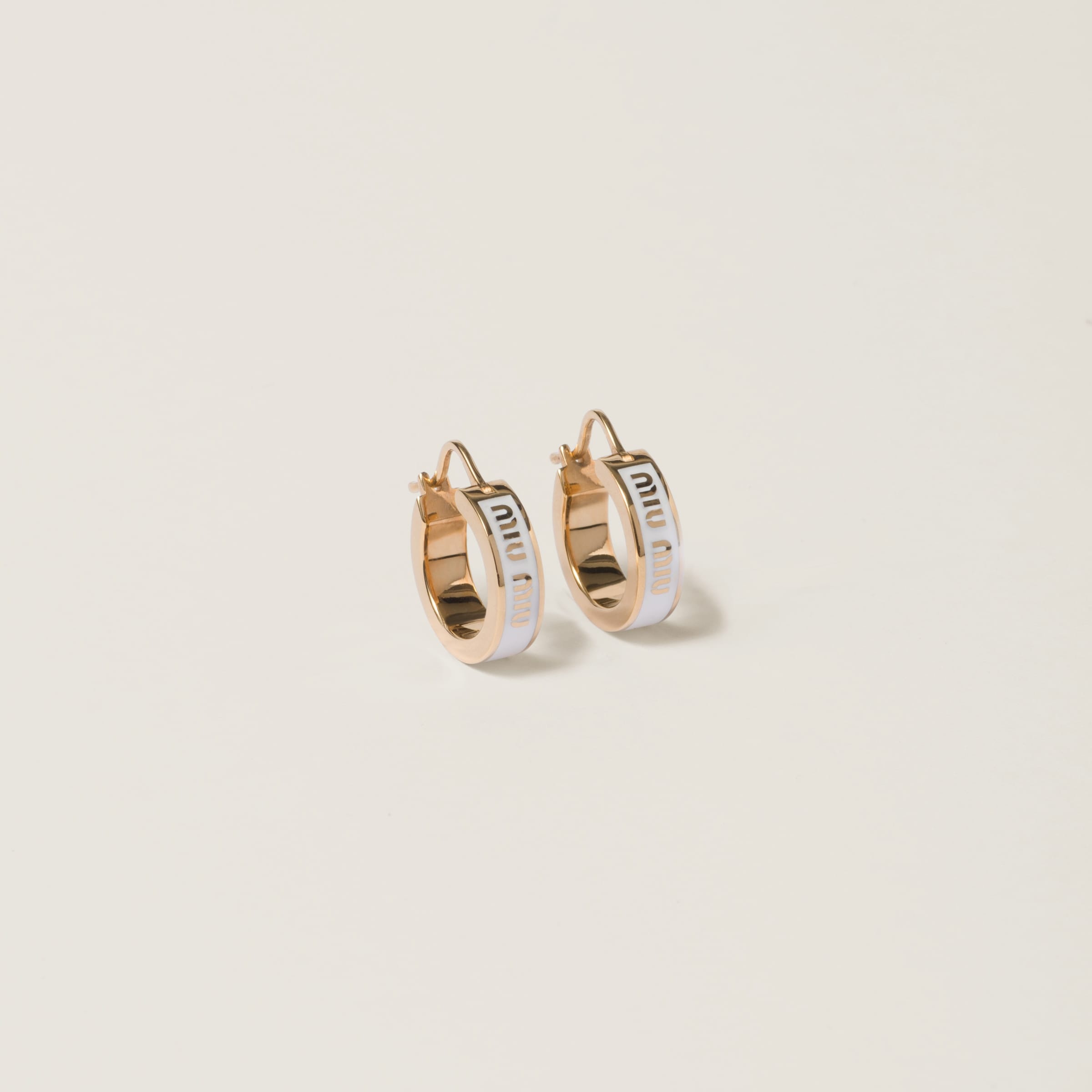 The Miu Miu logo becomes the protagonist of a selection of enameled metal earrings with a shape that recalls a circle. The logo stands out as an iconic symbol, giving the accessory modern allure. - Product code: 5IO103_2F6T_F0009 - Metal and colored enamel - For pierced ears - Visible logo - Imported Height 1.7cm Width 0.5cm Length 1.7cm Materials Main material: Brass