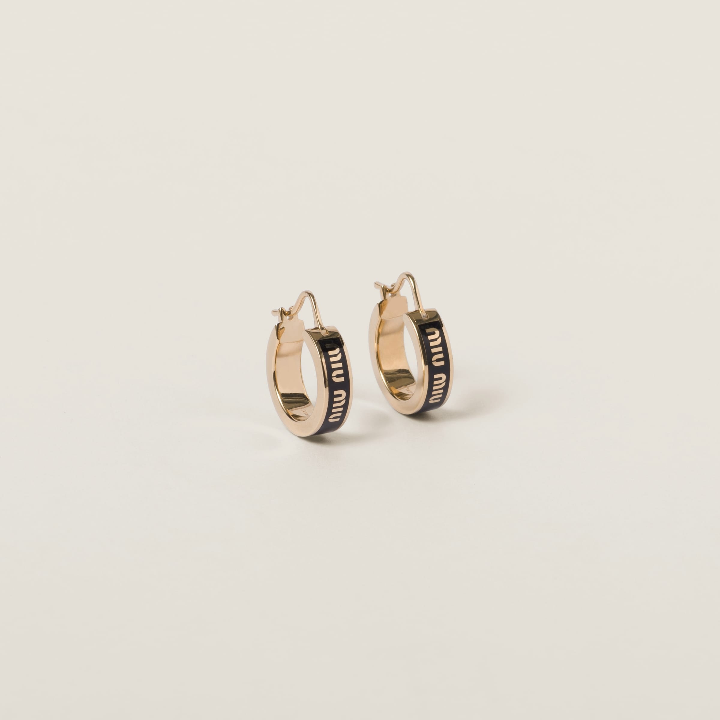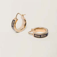 The Miu Miu logo becomes the protagonist of a selection of enameled metal earrings with a shape that recalls a circle. The logo stands out as an iconic symbol, giving the accessory modern allure. - Product code: 5IO103_2F6T_F0002 - Metal and colored enamel - For pierced ears - Visible logo - Imported Height 1.7cm Width 0.5cm Length 1.7cm Materials Main material: Brass
