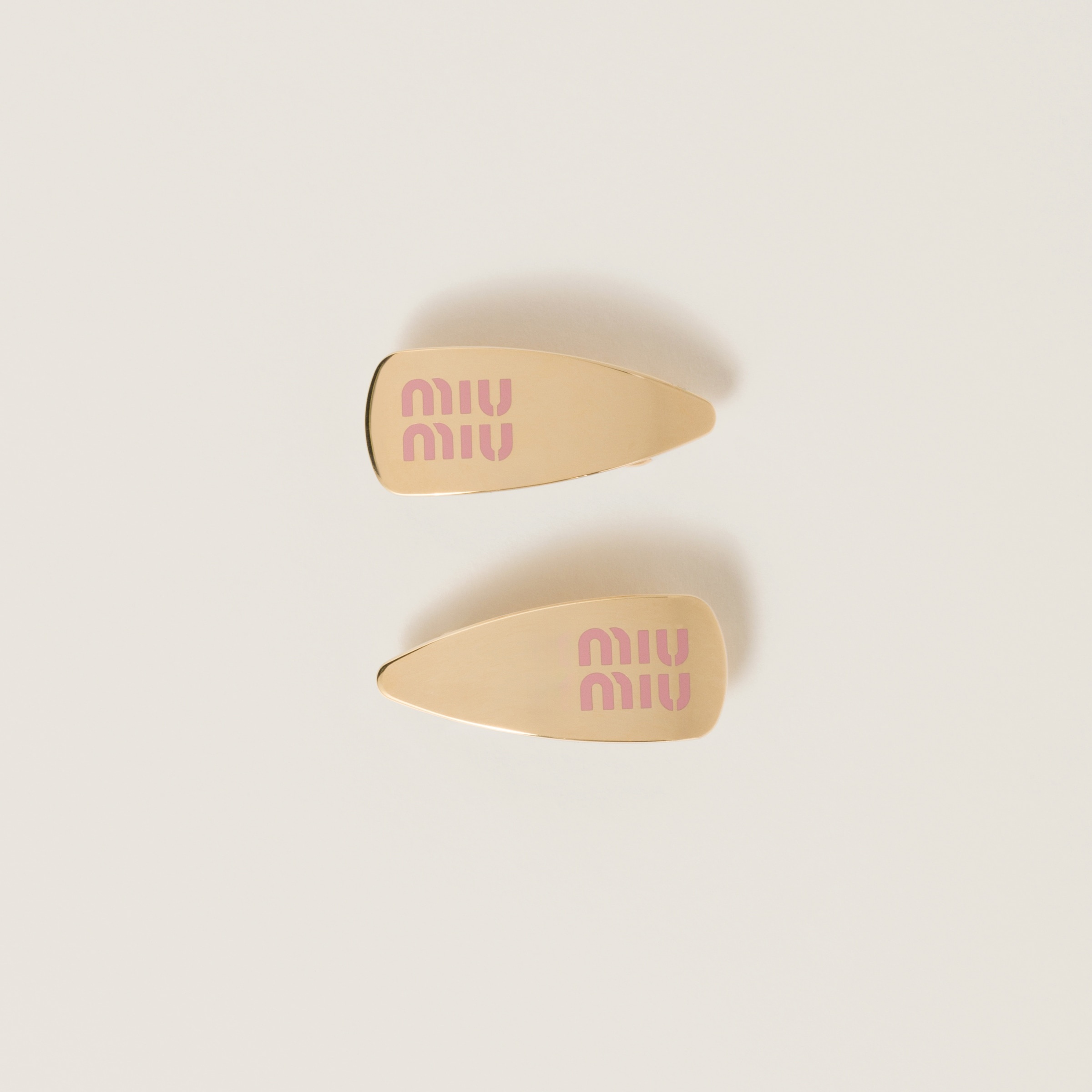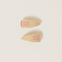 The iconic Miu Miu logo stands out on these enameled metal hair clips with an iconic allure. - Product code: 5IF173_2F6T_F0615 - Colored enameled metal - Visible logo - Set of two hair clips - Imported Height 1.65cm Width 4cm Materials Main material: Enamel Brass
