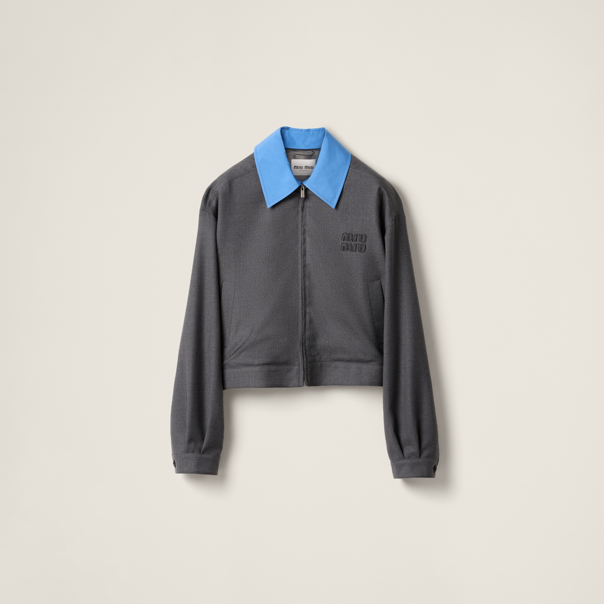 The periwinkle blue poplin collar highlights the contemporary layering of this gabardine blouson jacket, defining a garment with a relaxed fit and bold versatility. - Product code: ML1052_16E8_F0308_S_OOO - Lined garment - Long sleeves - Shirt-style collar - Cuff with buttons - Zipper closure - Vertical pockets - Drawstring hem - Embroidered logo - Imported - The model is 178 cm tall and wears a size 38 Height 53cm Materials Main material: 100% Virgin Wool