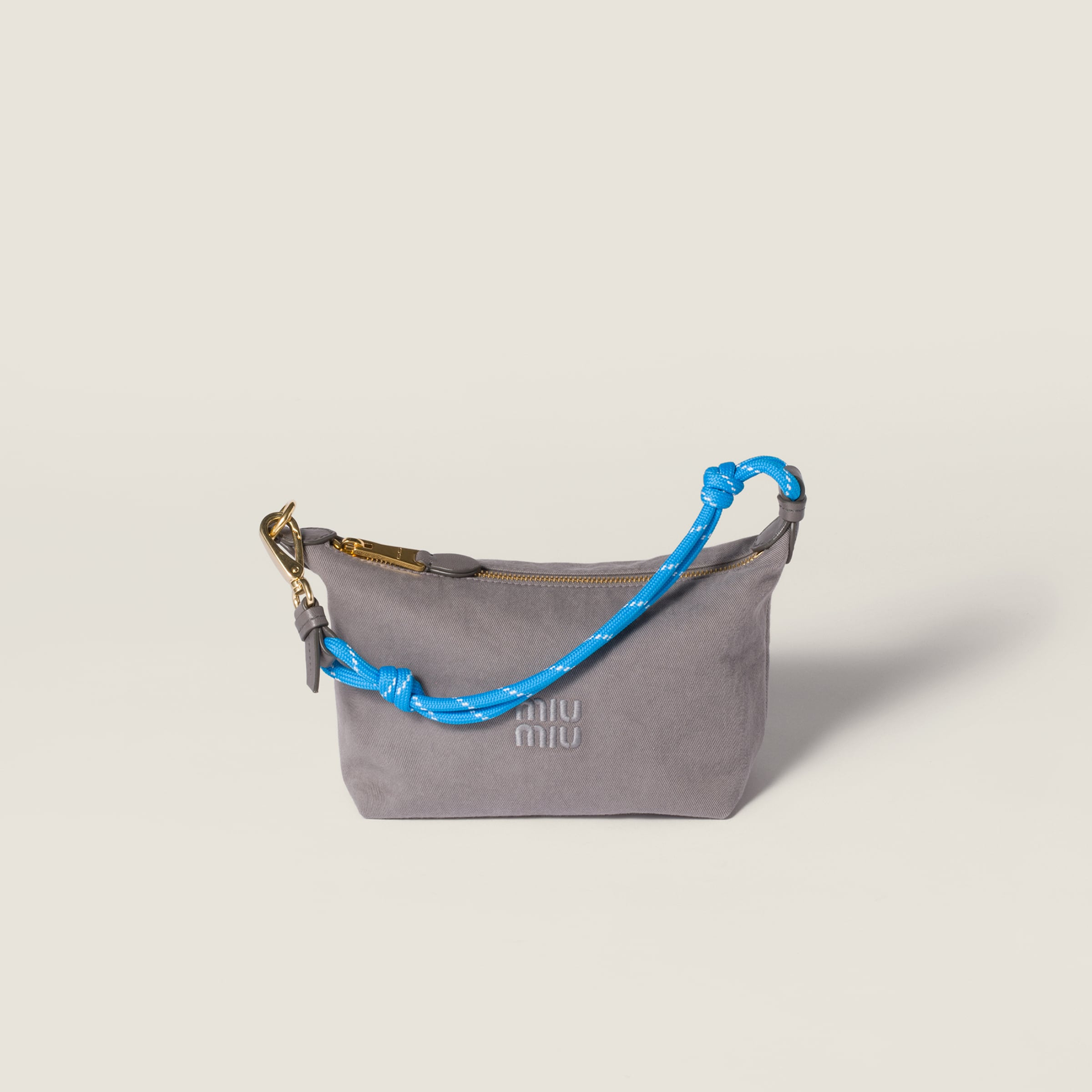 The lines of this pouch are sleeker thanks to the gabardine fabric and embroidered tonal logo, while the two-tone woven tape wristlet becomes an iconic element of Miu Miu style. - Product code: 5NE841_2IA7_F04S3 - Zipper closure - Woven technical tape wristlet with snap-hook - Technical fabric lining - Embroidered lettering logo - Imported Height 14cm Width 18.5cm Length 10cm Materials Main material: Cotton