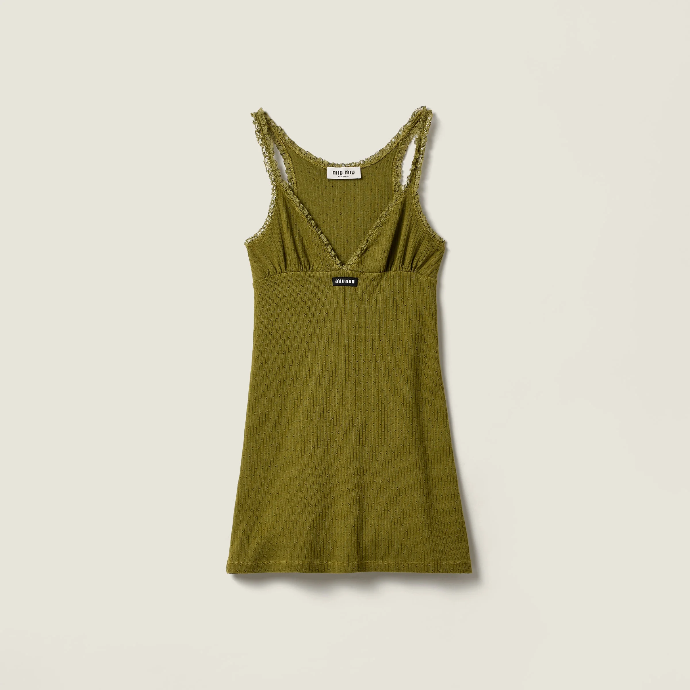 A refined pointelle knit, inspired by classic lingerie, lends exclusivity and charm to this dress in garment-dyed cotton, with delicate lace details that enhance the dye’s intense tone. - Product code: MF6263_19DF_F0393_S_OOO - Fitted fit - Unlined garment - V-neck with lace detail - Straight hem - Knitted logo label - Imported - The model is 176 cm tall and wears a size 38 Height 45cm Materials Main material: 100% Cotton