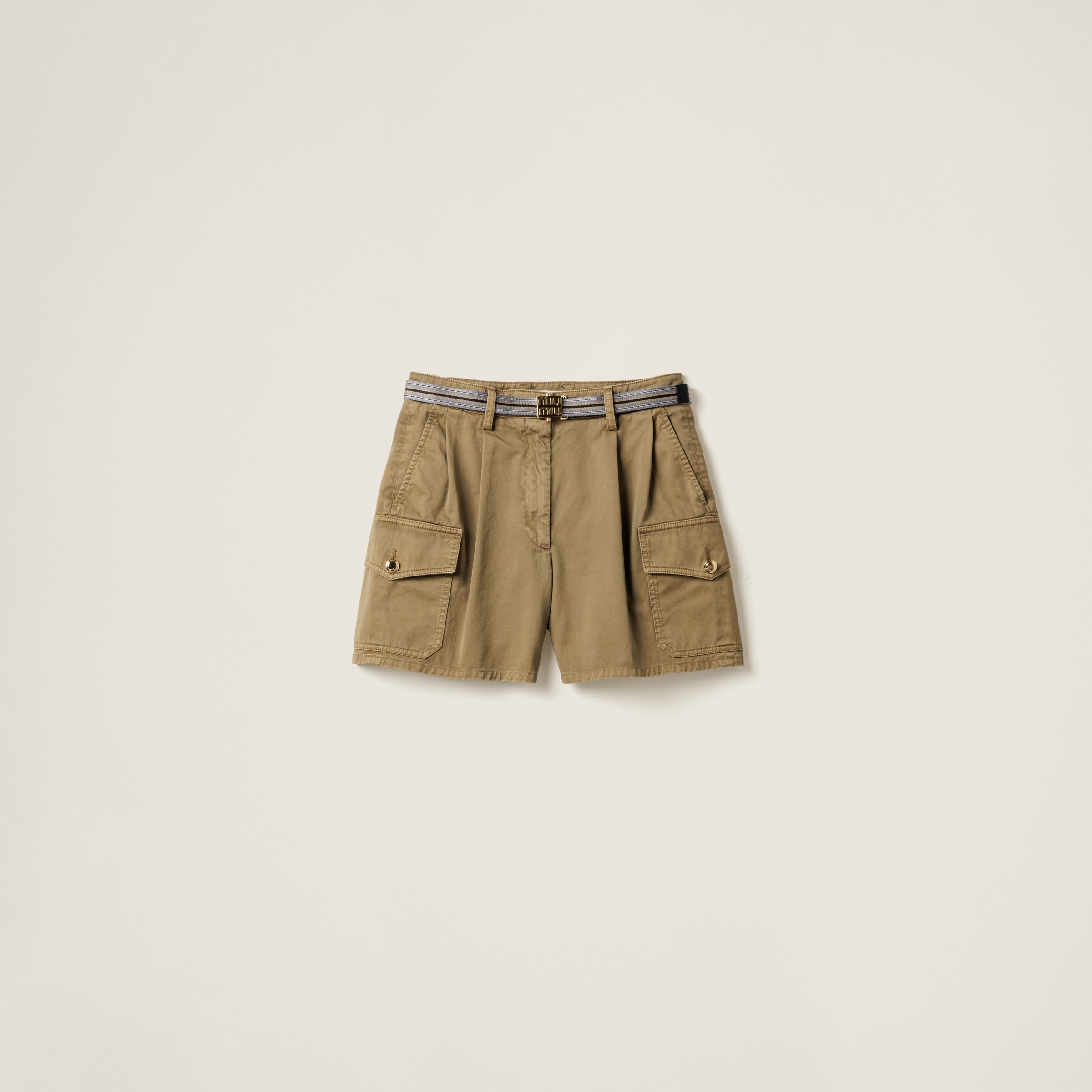 These versatile, simple cotton satin shorts play with menswear. The side pockets and the logo belt detail are distinctive elements that express Miu Miu's vintage spirit. - Product code: MP1853_16MS_F0393_S_OOO - Wide-leg fit - Unlined garment - Zipper fly with button - Angled pockets - Back welt pockets - Leather belt with logo detail - Embroidered logo - Imported - The model is 177 cm tall and wears a size 38 Height 44cm Materials Main material: 100% Cotton
