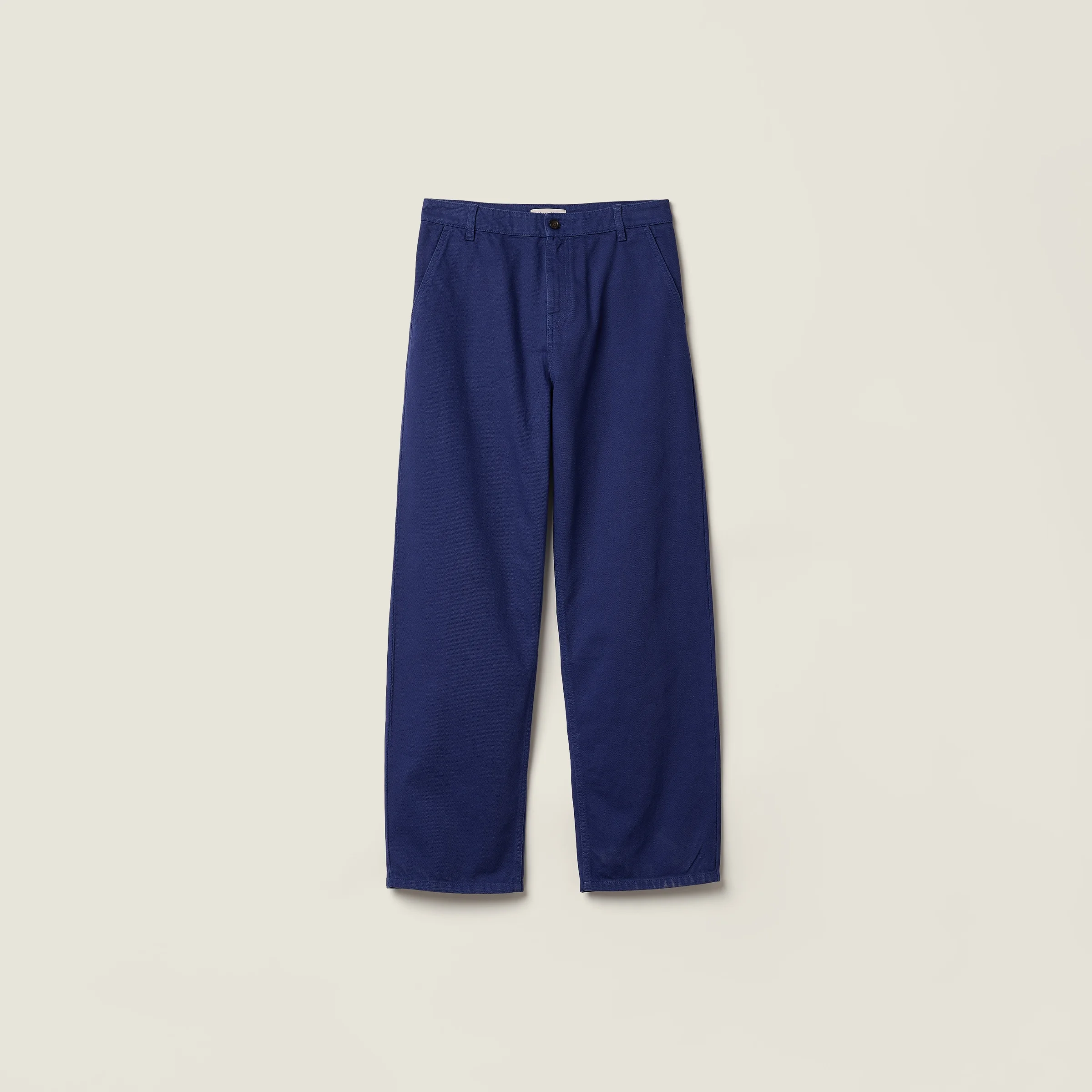 Inspired by workwear, these gabardine pants have a relaxed fit and menswear cut. The resistant diagonal weave, enhanced by garment dyeing, gives the pants an authentic, vintage look. - Product code: MP1970_19JY_F0021_S_OOO - Straight leg fit - Zipper fly with button - Angled front slash pockets - Back welt pockets with button - Embroidered logo - Imported - The model is 176 cm tall and wears a size 38 Height 112cm Materials Main material: 100% Cotton