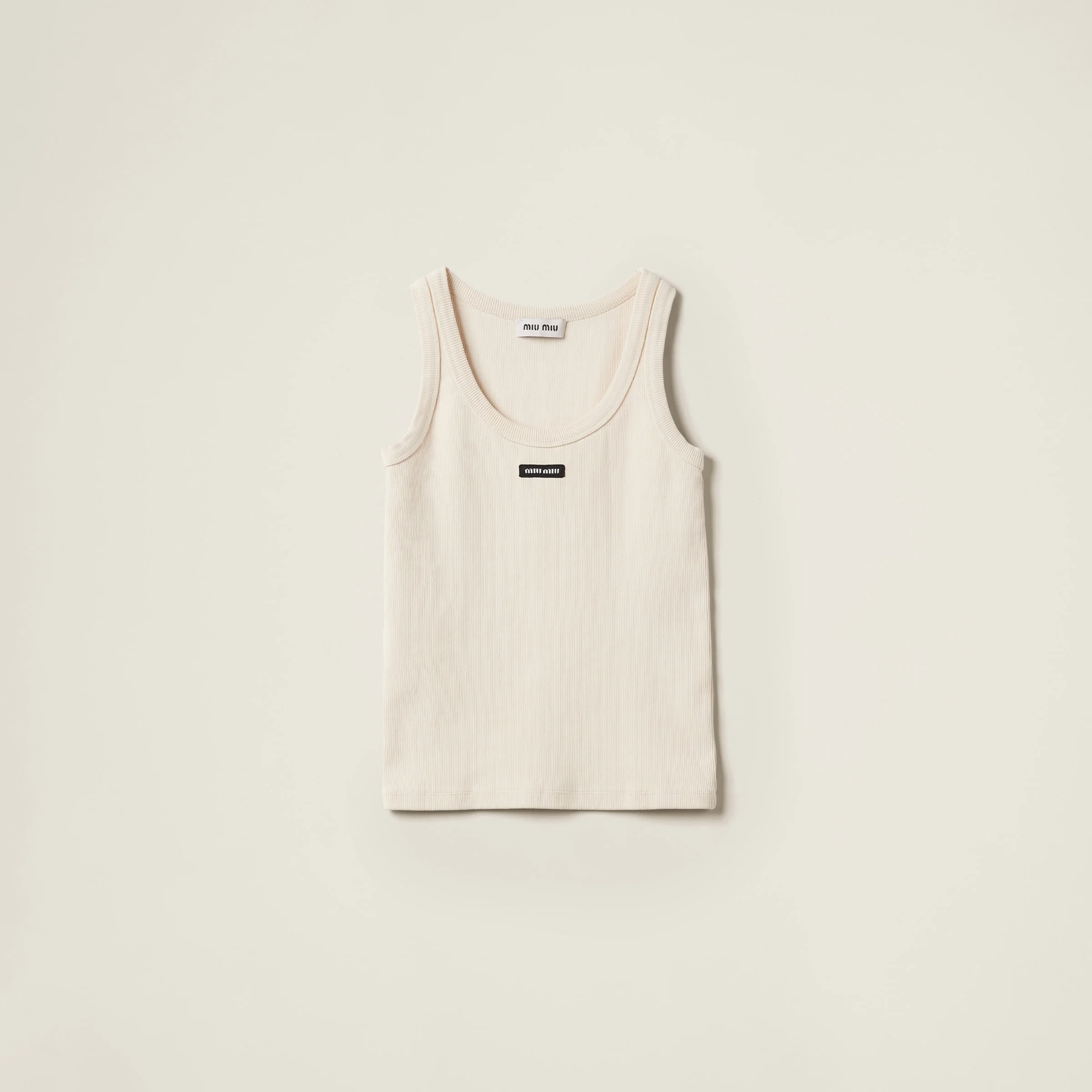 The Miu Miu logo patch stands out on the sleek, slim-fit lines of this garment-dyed ribbed knit jersey top thanks to its iconic and distinctive character. - Product code: MJT694_1464_F0018_S_OOO - Slim fit - Sleeveless - Logo patch - Twin-needle hem - Imported - The model is 176 cm tall and wears a size 38 Height 60cm Materials Main material: 99% Cotton 1% Elastane