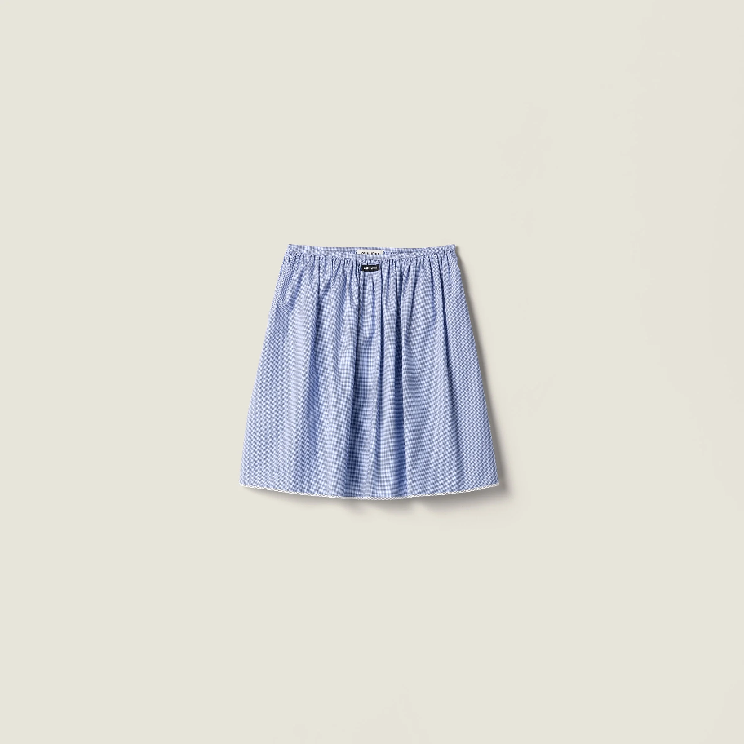 Elements of childhood wardrobes lend freshness and ease to this cotton skirt, where the classic gingham pattern is paired with an elegant hem embroidery, reminiscent of runway shows. - Product code: MG2425_187G_F0AZ1_S_OOO - Flared fit - Unlined garment - Side hook-and-zip closure - Side pockets - Embroidered hem - Jacquard logo - Imported - The model is 180 cm tall and wears a size 38 Height 55cm Materials Main material: 100% Cotton
