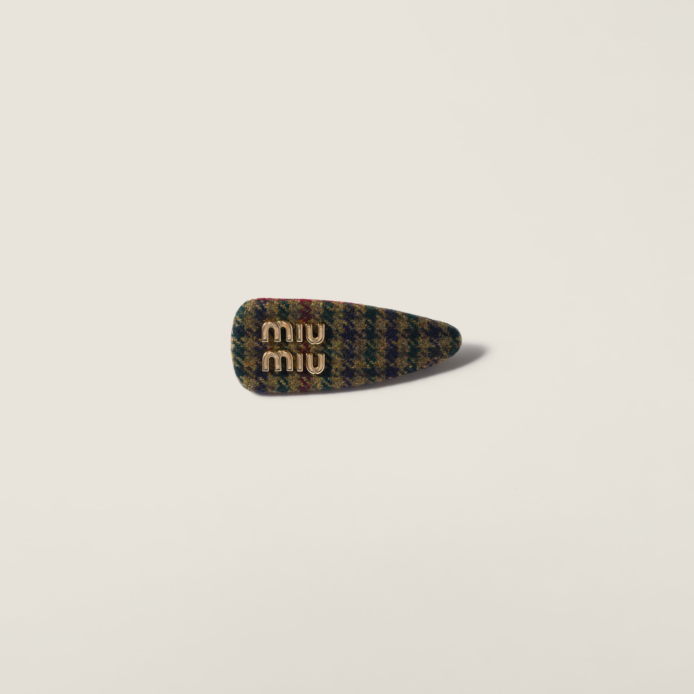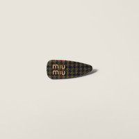 The timeless houndstooth pattern enhances the character and essential design of this hair clip, highlighting Miu Miu’s experimental dialogue with iconic elements of the men’s wardrobe. - Product code: 5IF092_2IEP_F0244 - Metal clip closure on the back - Metal logo lettering - Imported Materials Main material: Virgin Wool