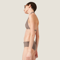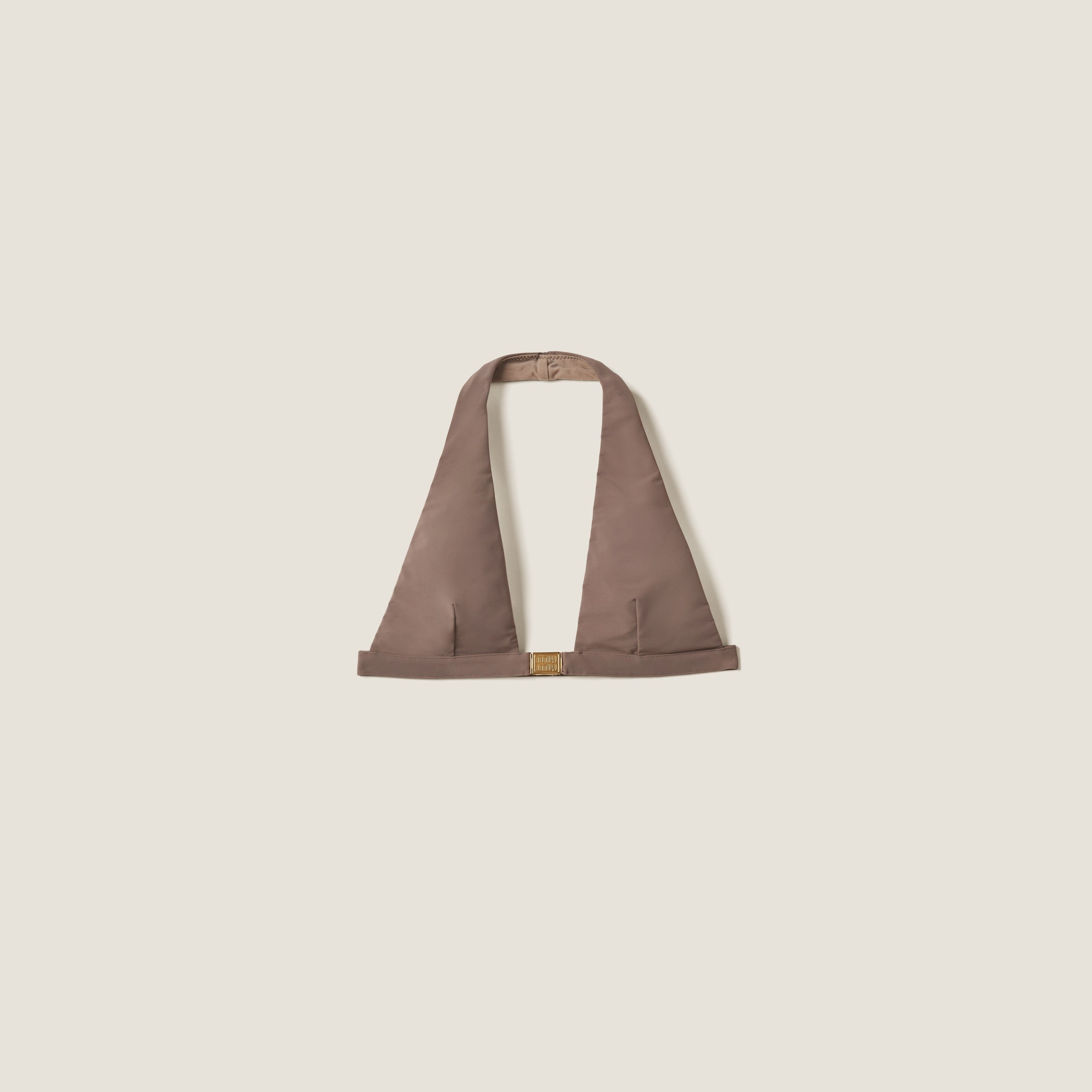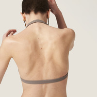 The light, soft, compact and resistant texture of technical fabric is combined with the sleek lines of this top bikini. The garment features a buckle with the Miu Miu logo that adds its signature touch and an iconic note to the design. - Product code: MCO233_131E_F0572_S_OOO - Bralette style - Logo-engraved buckle clasp with magnet - Lined - Imported - The model is 178 cm tall and wears a size 38 Materials Main material: 22% Elastane 78% Recycled Polyamide