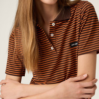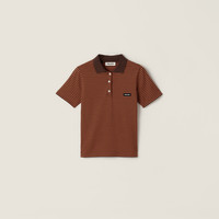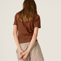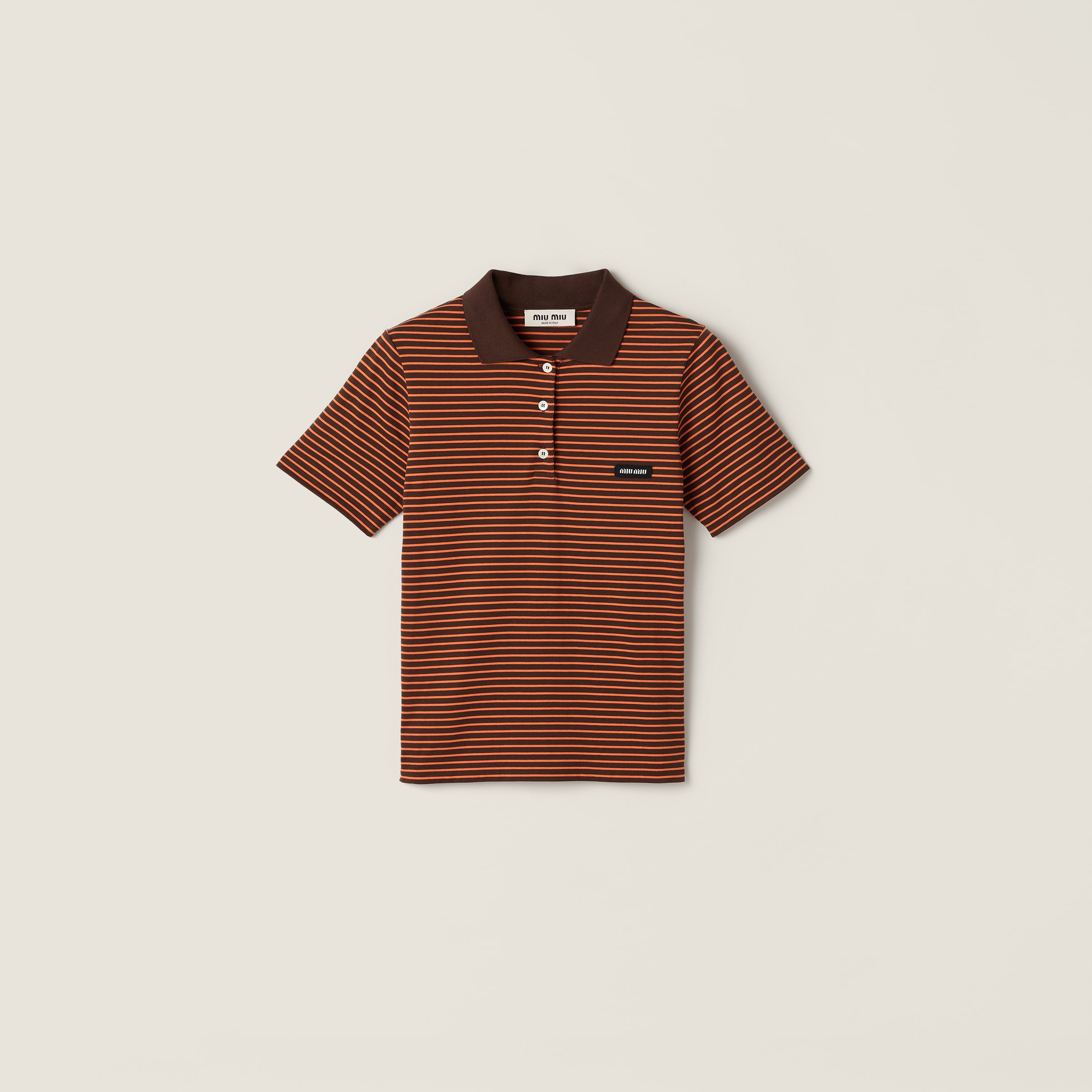 Stripes, an emblem of Miu Miu style, recall a vintage aesthetic that adds playful simplicity to this jersey polo shirt, ideal for creating bold looks through layering different volumes and patterns. - Product code: MJNA13_14RT_F0Q1K_S_OOO - Straight fit - Unlined garment - Polo collar - Front button closure - Short sleeves - Twin-needle hem - Logo patch - Imported - The model is 178 cm tall and wears a size 38 Height 59cm Materials Main material: 100% Cotton