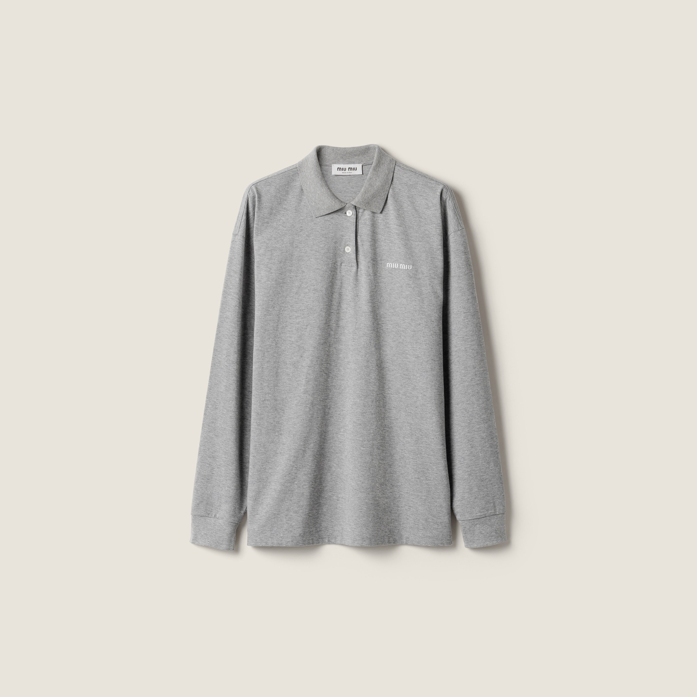 Jersey, an emblematic fabric in the Miu Miu wardrobe, reinterprets the simple character of the polo shirt, playing with menswear classics and highlighting its relaxed and contemporary versatility. - Product code: MJL054_1610_F0031_S_OOO - Boxy fit - Unlined garment - Long sleeves with ribbed knit cuffs - Polo collar - Front button closure - Twin-needle hem - Embroidered logo - Imported - The model is 178 cm tall and wears a size 38 Height 75cm Materials Main material: 100% Cotton