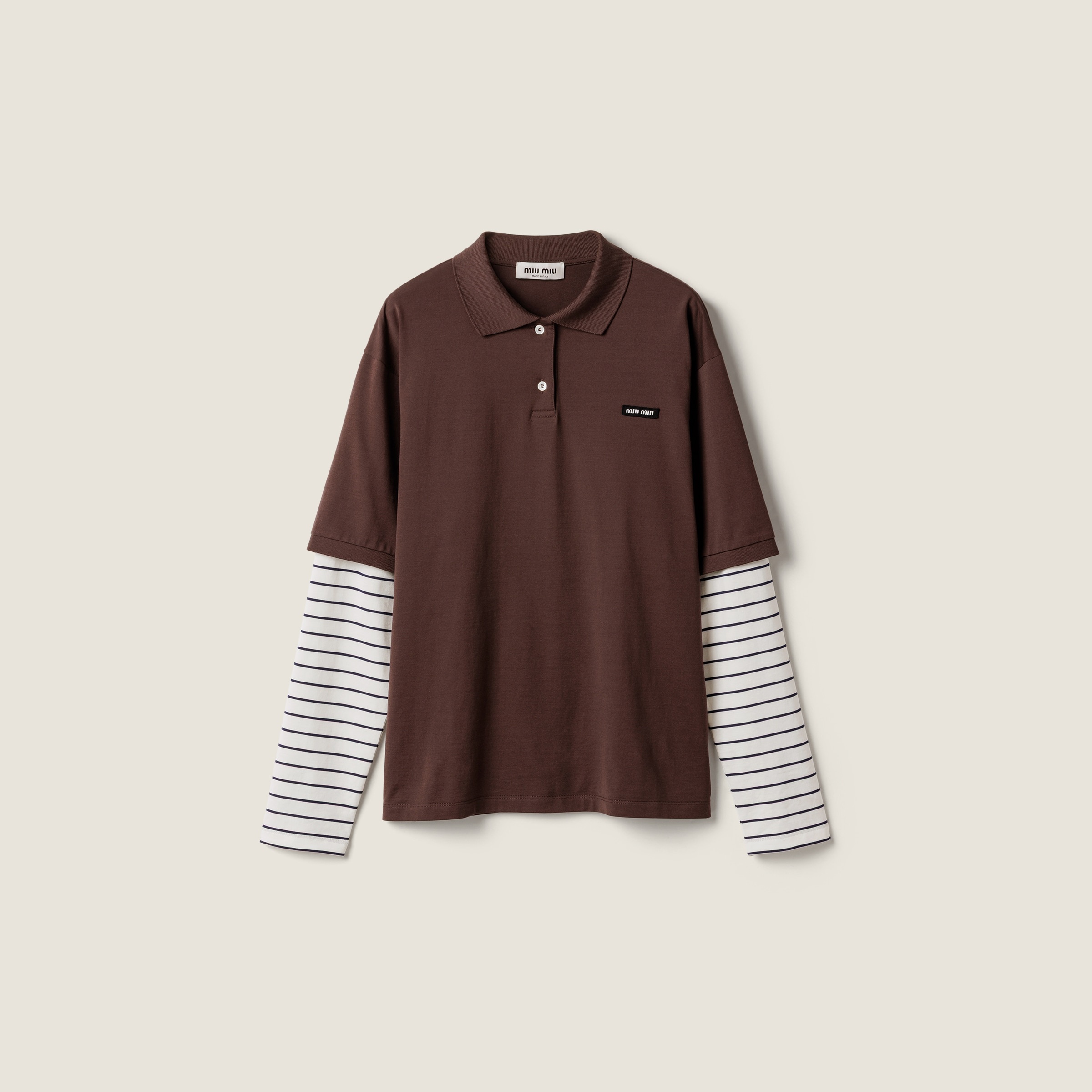 Miu Miu style icons like the polo shirt and striped jersey come together in a garment that interprets layering from a contemporary perspective for playful looks and free, personal interpretations. - Product code: MJL076_17OR_F0RQM_S_OOO - Boxy fit - Unlined garment - Long sleeves - Polo collar - Front button closure - Twin-needle hem - Logo patch - Imported - The model is 181 cm tall and wears a size 38 Height 70cm Materials Main material: 100% Cotton