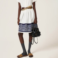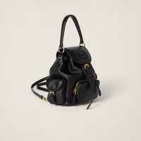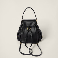 This leather backpack inspired by school gear combines artisan appeal and a casual attitude. The multi-pocket design and the option of wearing it as a crossbody bag express the contemporary and playful spirit of Miu Miu bags. - Product code: 5BZ043_2CRW_F0002_V_OOO - Leather handle - Front zipper pocket - Side flap pockets - Gold-tone hardware - Flap closure with buckle - Linen blend interior with patch pocket - Backpack can be worn two ways: classic harness with straps, minimum length 65 cm, maximum length 68 cm, or crossbody strap, length 110 cm - drop 53 cm - Leather lettering logo on the flap - Imported Height 22cm Width 18cm Length 11.5cm Materials Main material: Calfskin