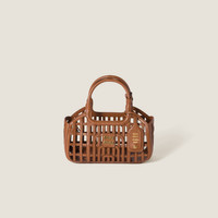 A refined woven motif defines the distinctive structure of this soft nappa leather bag that recalls summer inspirations and reflects the elegant sophistication of the Miu Miu collection. - Product code: 5BA294_2IBE_F0046_V_OOO - Open basket-weave motif - Detachable, adjustable leather shoulder strap. Minimum length: 105 cm - Maximum length: 115 cm - Minimum drop: 52 cm - Maximum drop: 58 cm - Removable trick - Gold-tone hardware - Metal lettering logo on the front - Imported Height 12.5cm Width 24cm Length 9cm Materials Main material: Calfskin