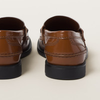 In the 1950s, loafers were part of the uniform worn by American college students. Opposed to wearing a uniform, students started inserting a penny in the slot on the leather strap, which originated the name "penny loafer." This timeless footwear synonymous with tradition is reimagined by Miu Miu in the new collection in a bolder version. - Product code: 5D773D_AZE_F031W_F_020 - Apron with leather strap and metal ornament - Leather lining - Embossed logo on the tongue - Rubber sole - Leather insole - Imported Materials Main material: Calfskin